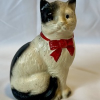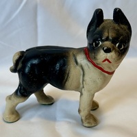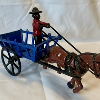 Grey Iron, donkey pulling blue cart, black driver with red coat, toy