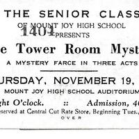 Mount Joy High School, senior class play ticket, The Tower Room Mystery, Thursday, November 19, 1942,Geo. Brown Sons Incorporated