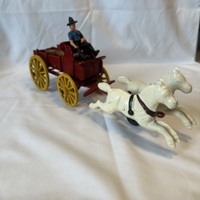 Grey Iron, white horses pulling red wagon carrying logs with driver, toy