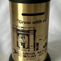 Union National Bank "Grow Old with Us" gold cylinder bank, FDIC