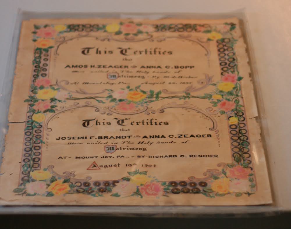 “Marriage Certificate 1904 Joseph Brandt and Anna Zeager,” MJAHS Online Inventory, accessed December 16, 2025, https://mountjoyhistory.com/inventory/items/show/12083.