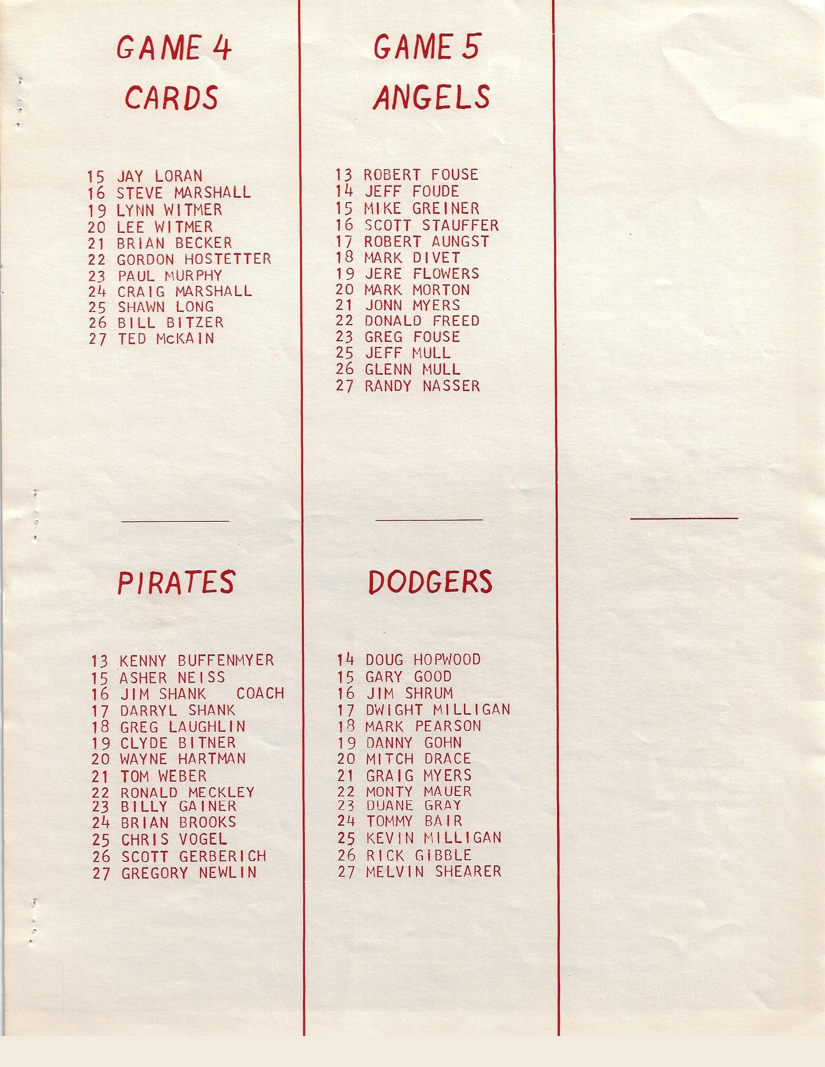 Game 5 Angels: Robert Fouse, Jeff Foude (Jeff Fouse), Mike Greiner, Scott Stauffer, Robert Aungst, Mark Divet, Jere Flowers, Mark Morton, Jonn Myers (John Myers), Donald Freed, Greg Fouse, Jeff Mull, Glenn Mull, Randy Nasser
