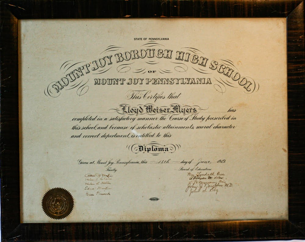Mount Joy Borough High School 1919 High School diploma, Lloyd Myers, framed