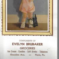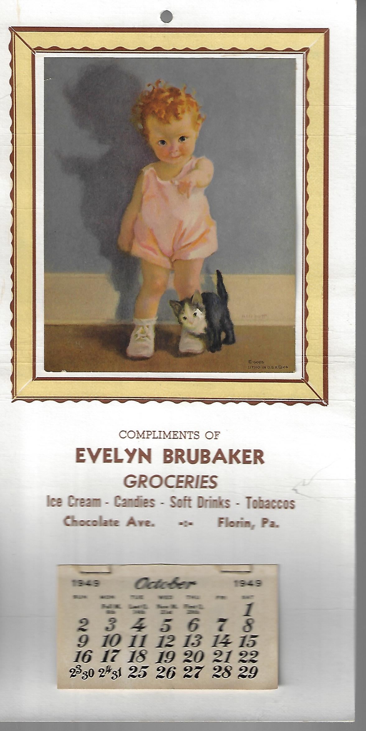 Evelyn Brubaker Groceries, 1949 calendar, ice cream, candies, soft drinks, tobaccos, Chocolate Avenue, Florin