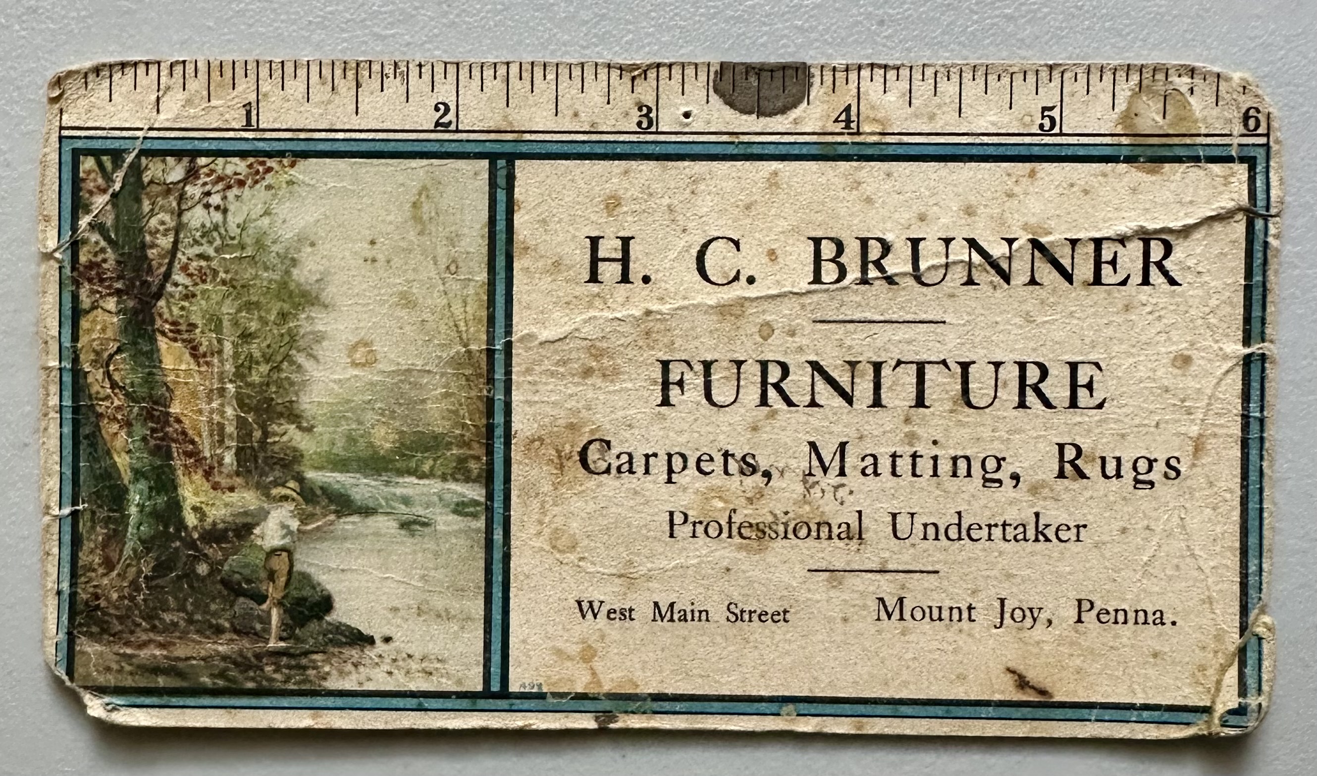 H. C. Brunner Furniture, Carpets, Matting, Rugs, Professional Undertaker advertisement card, ruler