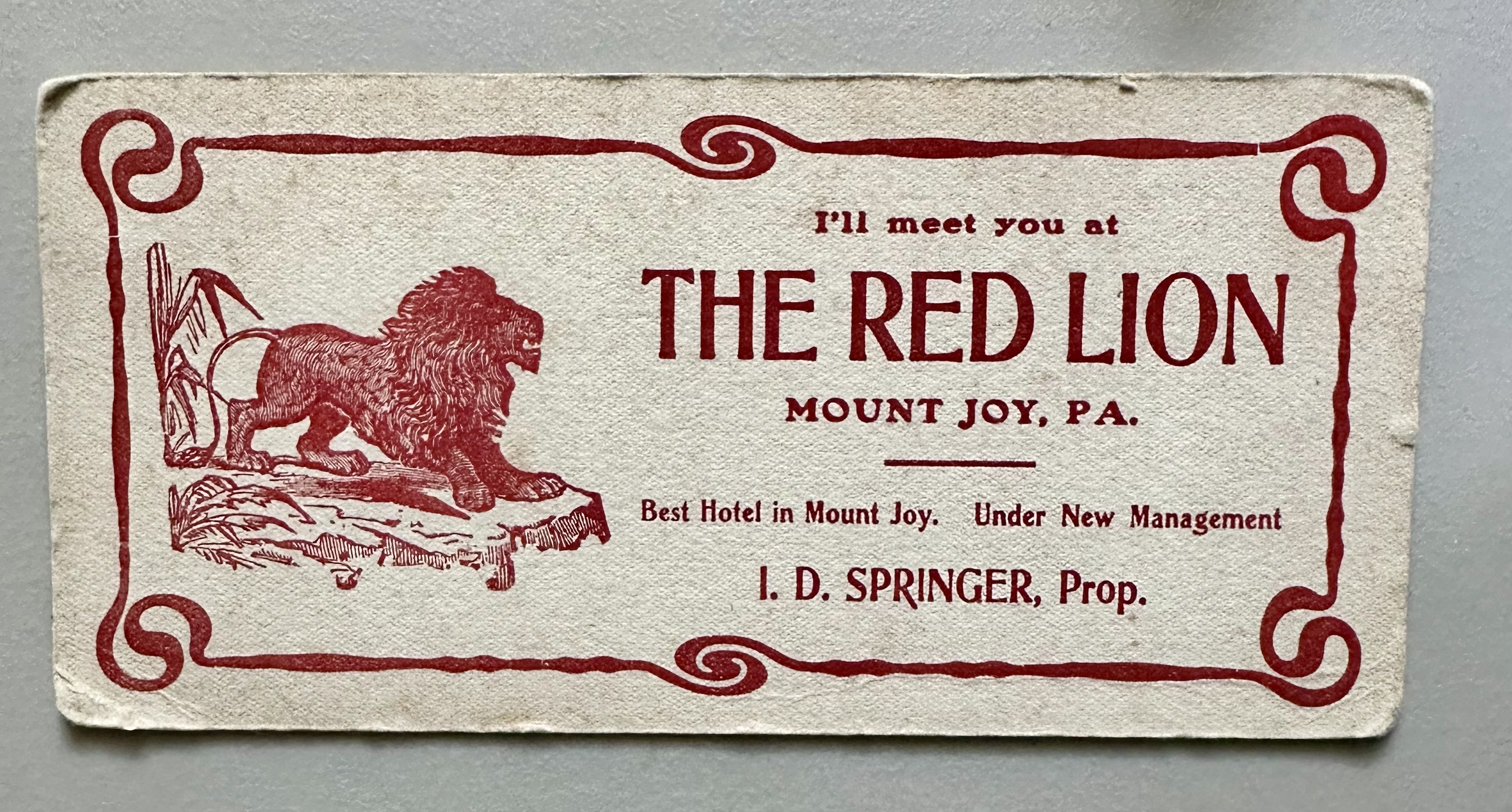 Red Lion Hotel, I. D. Springer, Proprietor advertisement card