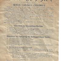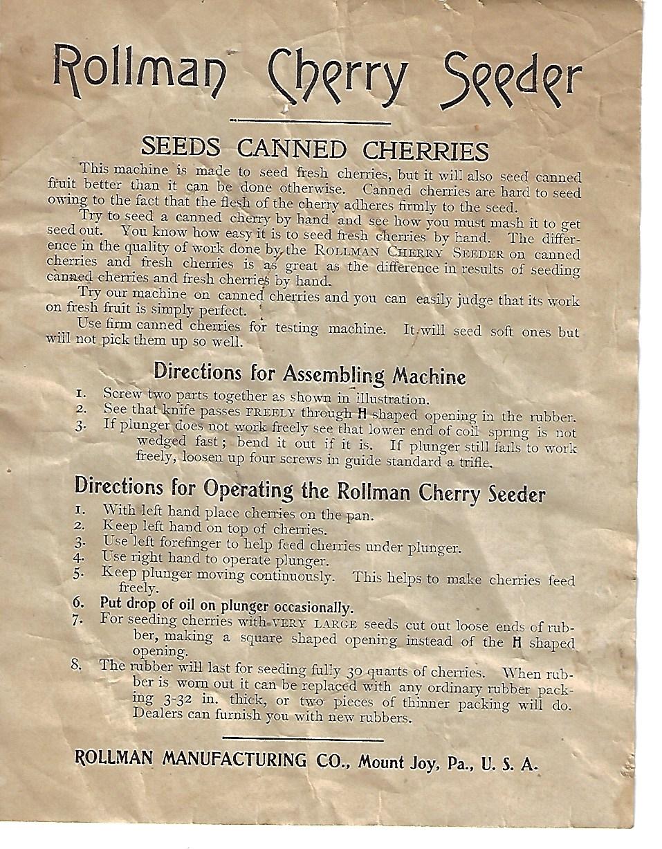 Produced by Rollman Manufacturing Company, Mount Joy. Directions for assembling the machine and operating the Rollman Cherry Seeder.