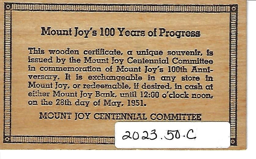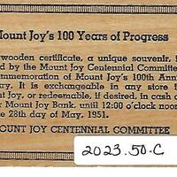 “Centennial wooden nickel - two cent,” MJAHS Online Inventory, accessed December 16, 2025, https://mountjoyhistory.com/inventory/items/show/12428.