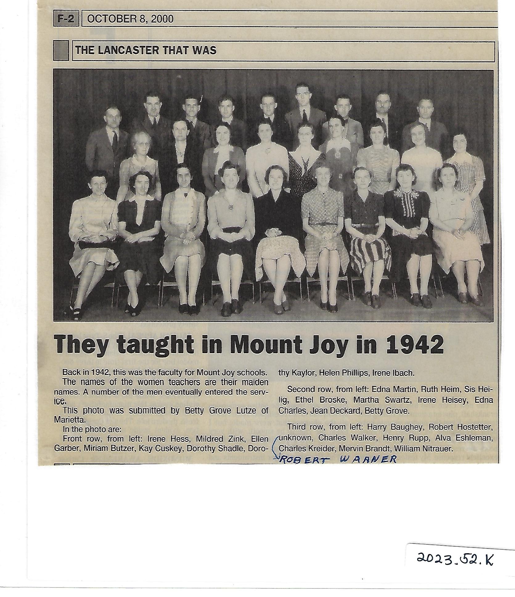 “Teachers, taught in Mount Joy in 1942,” MJAHS Online Inventory, accessed December 16, 2025, https://mountjoyhistory.com/inventory/items/show/12442.