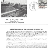 PRR Depot, Mount Joy Stamp Club, locomotive, Honesdale, 1834, 1836, Exchange Hotel, Brandt and Stehman's Mill, Spangler's, 1852, 1896, 1976