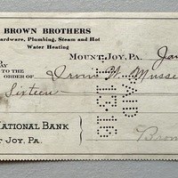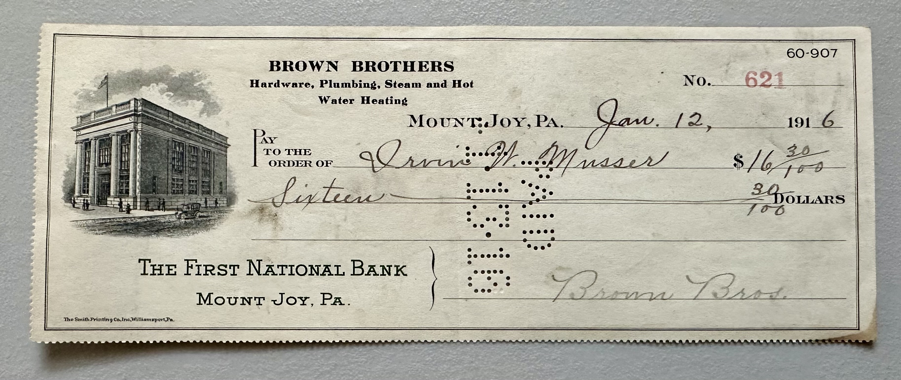 The First National Bank, Mount Joy, PA, “Brown Brothers cancelled check, pay to Irvin Musser, January 12, 1916,” MJAHS Online Inventory, accessed December 18, 2025, https://mountjoyhistory.com/inventory/items/show/12527.