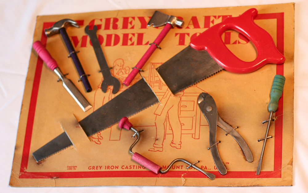 Grey Iron Casting Co., “Greycraft model tools on card, copyright 1940, (chisel, hammer, wrench, saw, screwdriver, pliers),” MJAHS Online Inventory, accessed December 19, 2025, https://mountjoyhistory.com/inventory/items/show/12594.