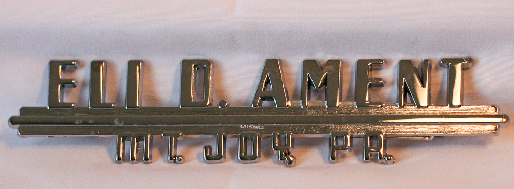 “Eli D. Ament, car name plate,” MJAHS Online Inventory, accessed December 21, 2025, https://mountjoyhistory.com/inventory/items/show/12608.