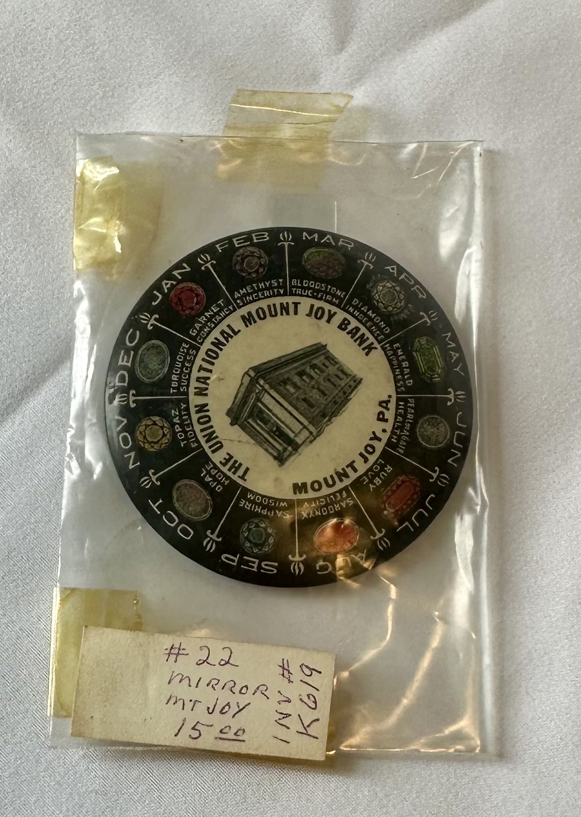 “Union National Mount Joy Bank mirror with Zodiac signs around edge,” MJAHS Online Inventory, accessed December 21, 2025, https://mountjoyhistory.com/inventory/items/show/12672.