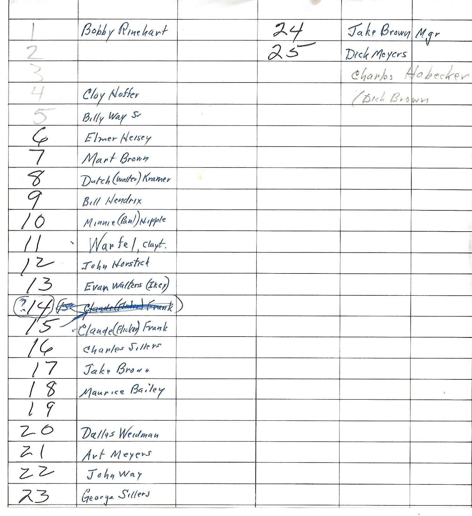 Mount Joy Band picture, 1921, Bobby Rinehart, Cloy Hoffer, Billy Way Sr., Elmer Heisey, Mart Brown, Dutch (Walter) Kramer, Bill Hendrix, Minnie (Paul) Hipple, Warfel, John Hostick, Evan Walters (Ikey), Claude (Flicker) Frank, Charles Sillers, Jake Brown, Maurice Bailey, Dallas Weidman, Art Meyers, John Way, George Sillers, Jake Brown, Dick Meyers, Charles Habecker, Dick Brown