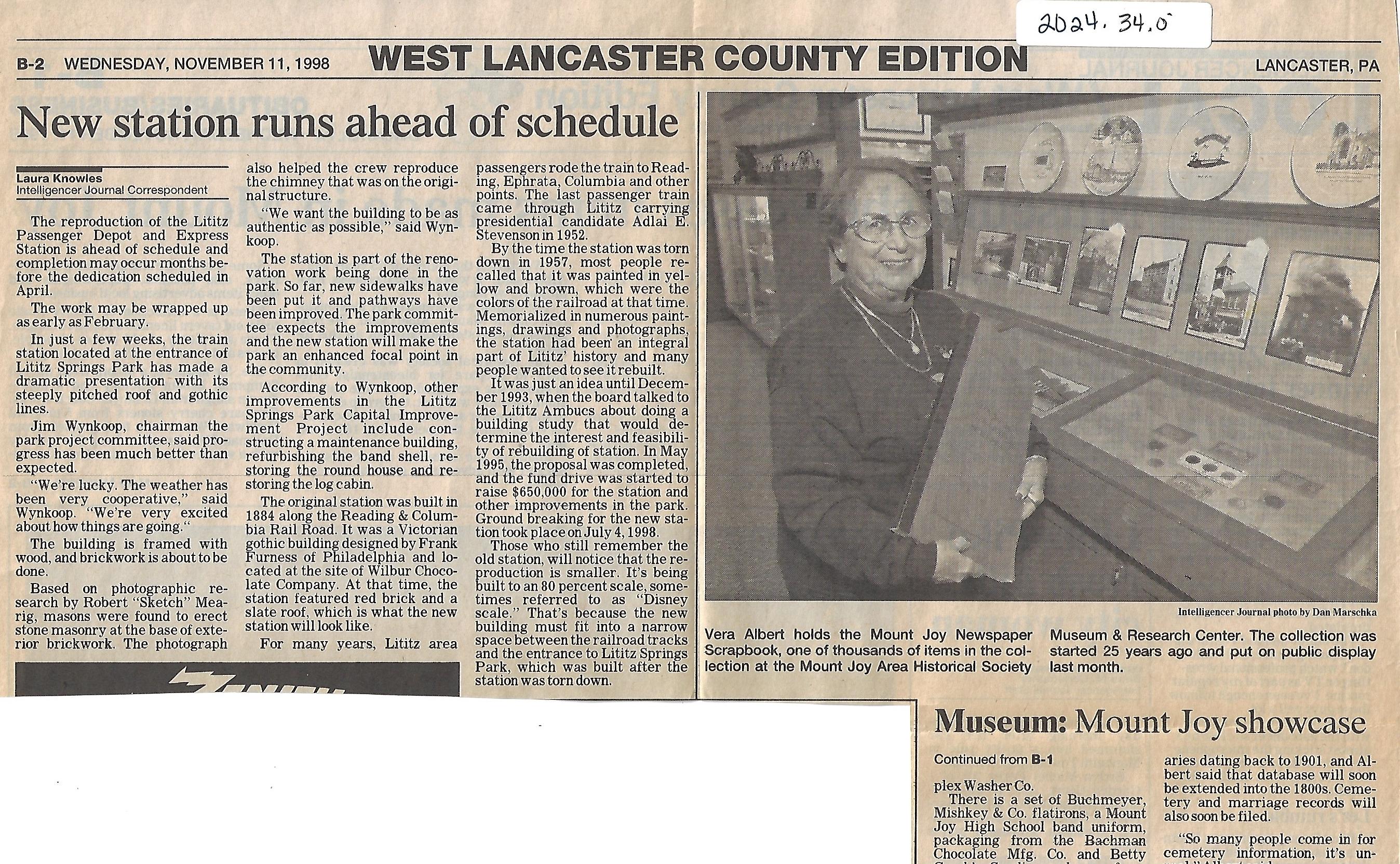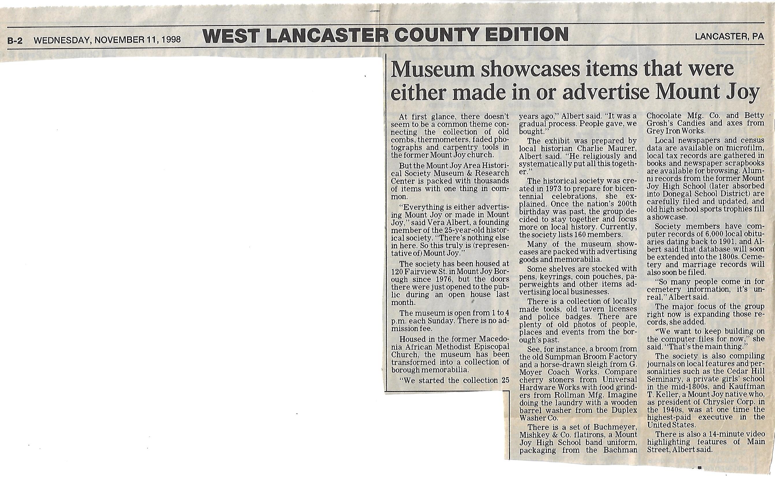 “Museum (Historical Society) showcases items made in and advertise Mount Joy, news article (copy), November 11, 1998,” MJAHS Online Inventory, accessed December 21, 2025, https://mountjoyhistory.com/inventory/items/show/12681.