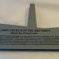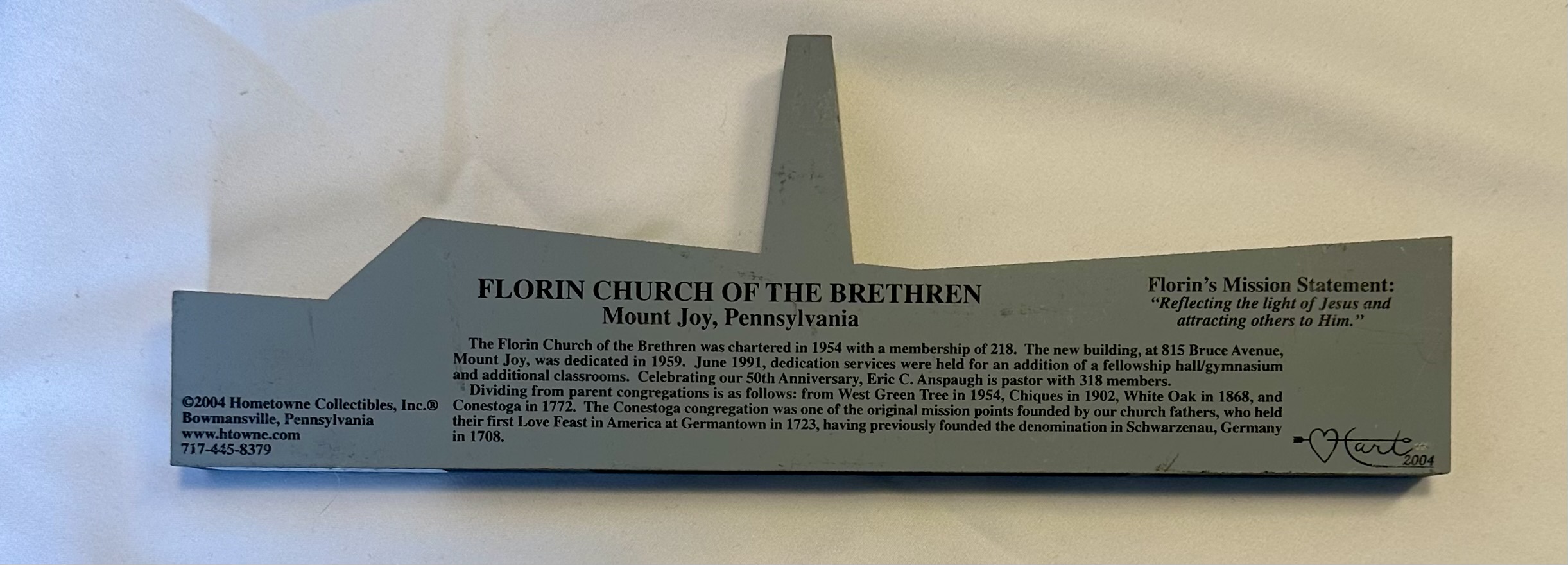 Florin Church of the Brethren, Cat's Meow wood block, 1954, 1959, June 1991, Eric C. Anspaugh, Germnantown 1723, Schwarzenau, Germany, West Green Tree, Chiques, White Oak, Conestoga