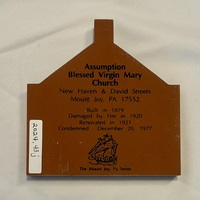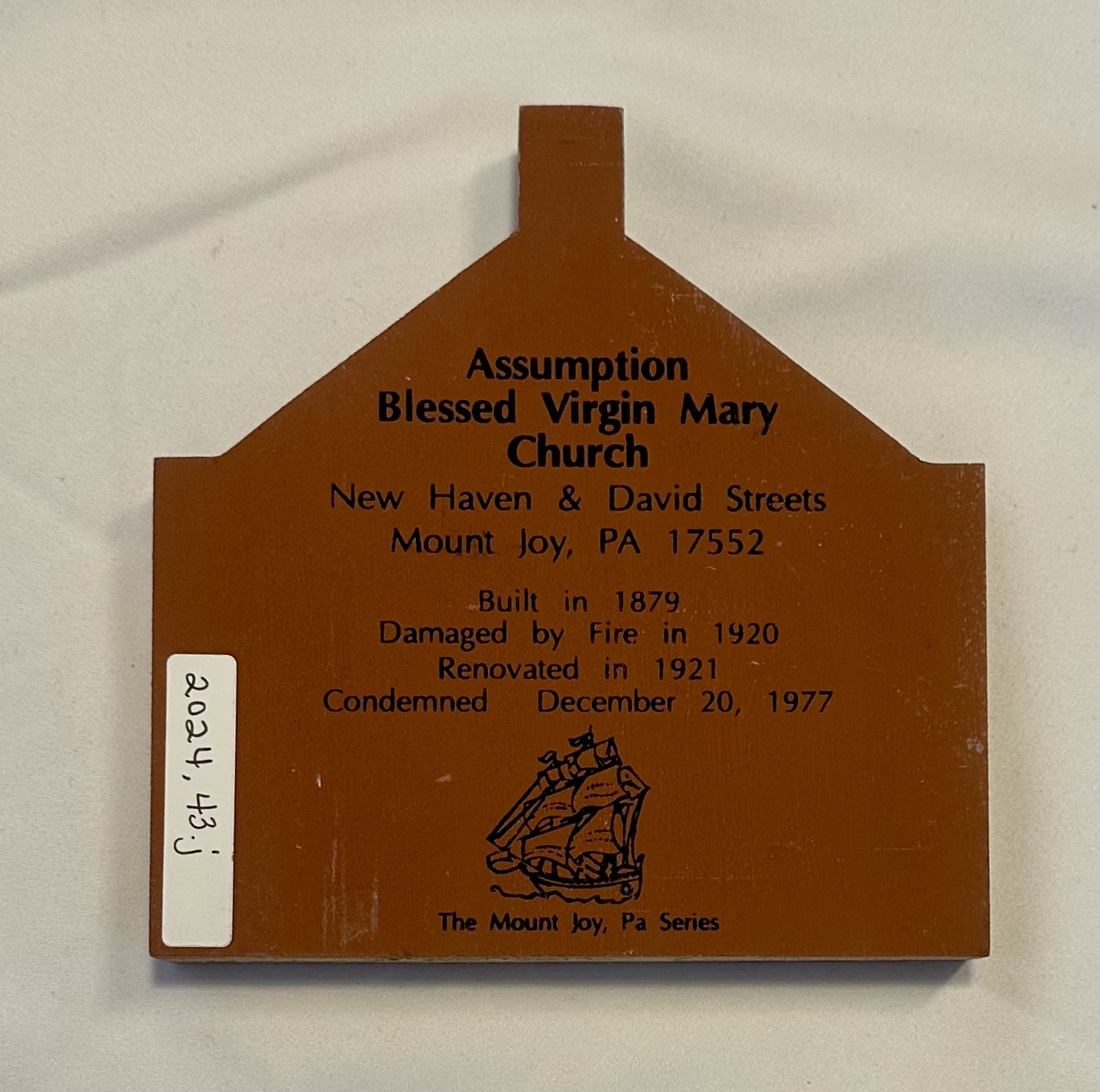 “Assumption Blessed Virgin Mary Church - New Haven Street and David Street Cat's Meow wood block,” MJAHS Online Inventory, accessed January 11, 2026, https://mountjoyhistory.com/inventory/items/show/12769.