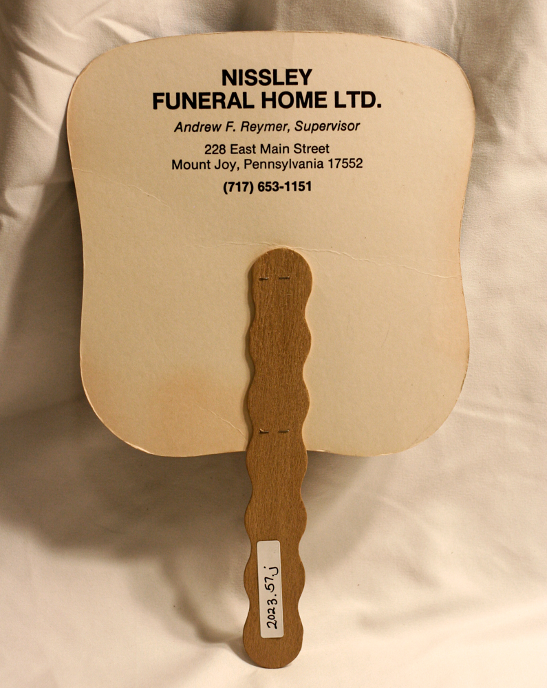 J. Cooper, “Nissley Funeral Home Ltd. Handled Fan, Chapel by the Lake,” MJAHS Online Inventory, accessed December 19, 2025, https://mountjoyhistory.com/inventory/items/show/12811.