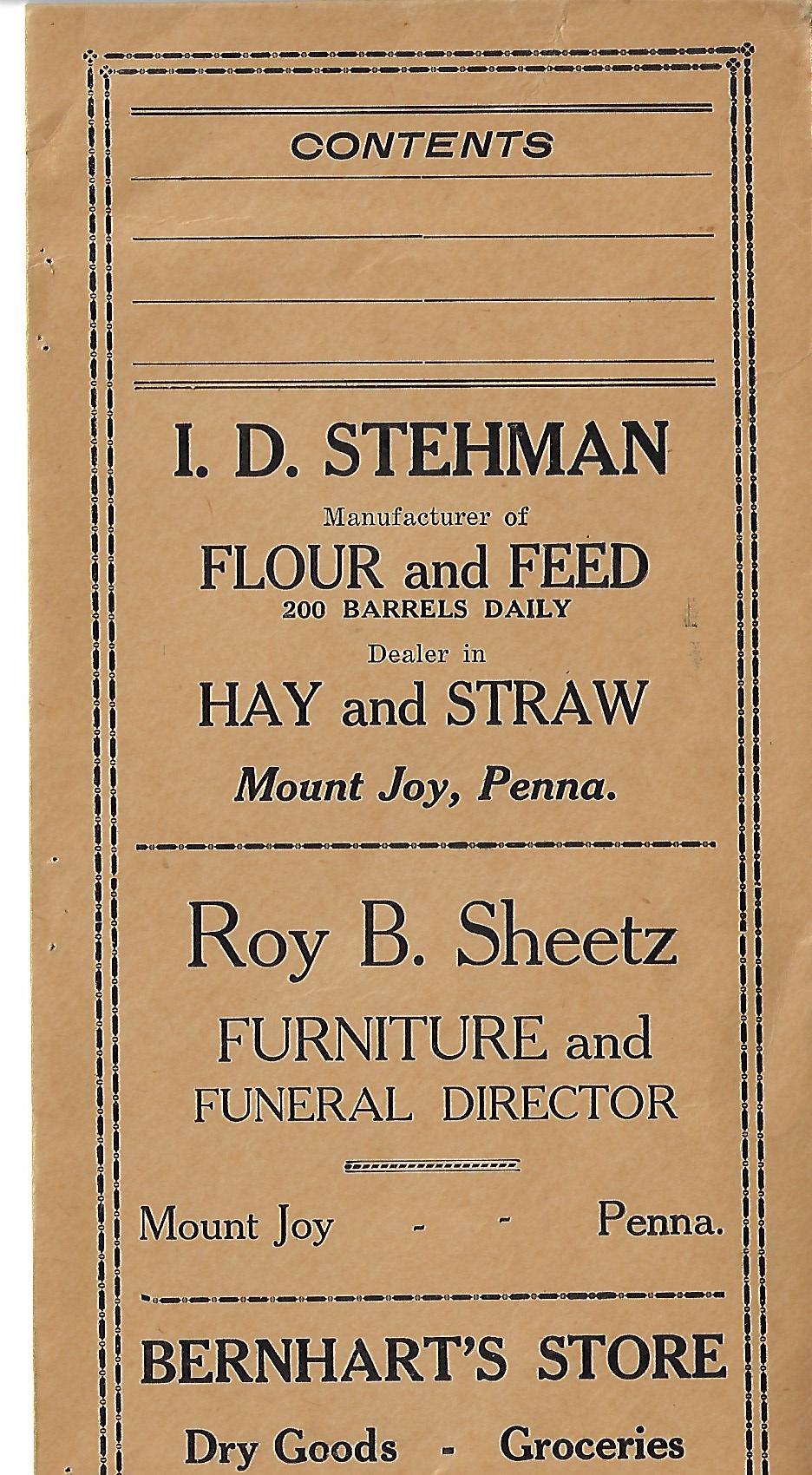 “I.D. Stehman/Roy B. Sheetz/Bernhart's Store Document Envelope,” MJAHS Online Inventory, accessed December 19, 2025, https://mountjoyhistory.com/inventory/items/show/12821.