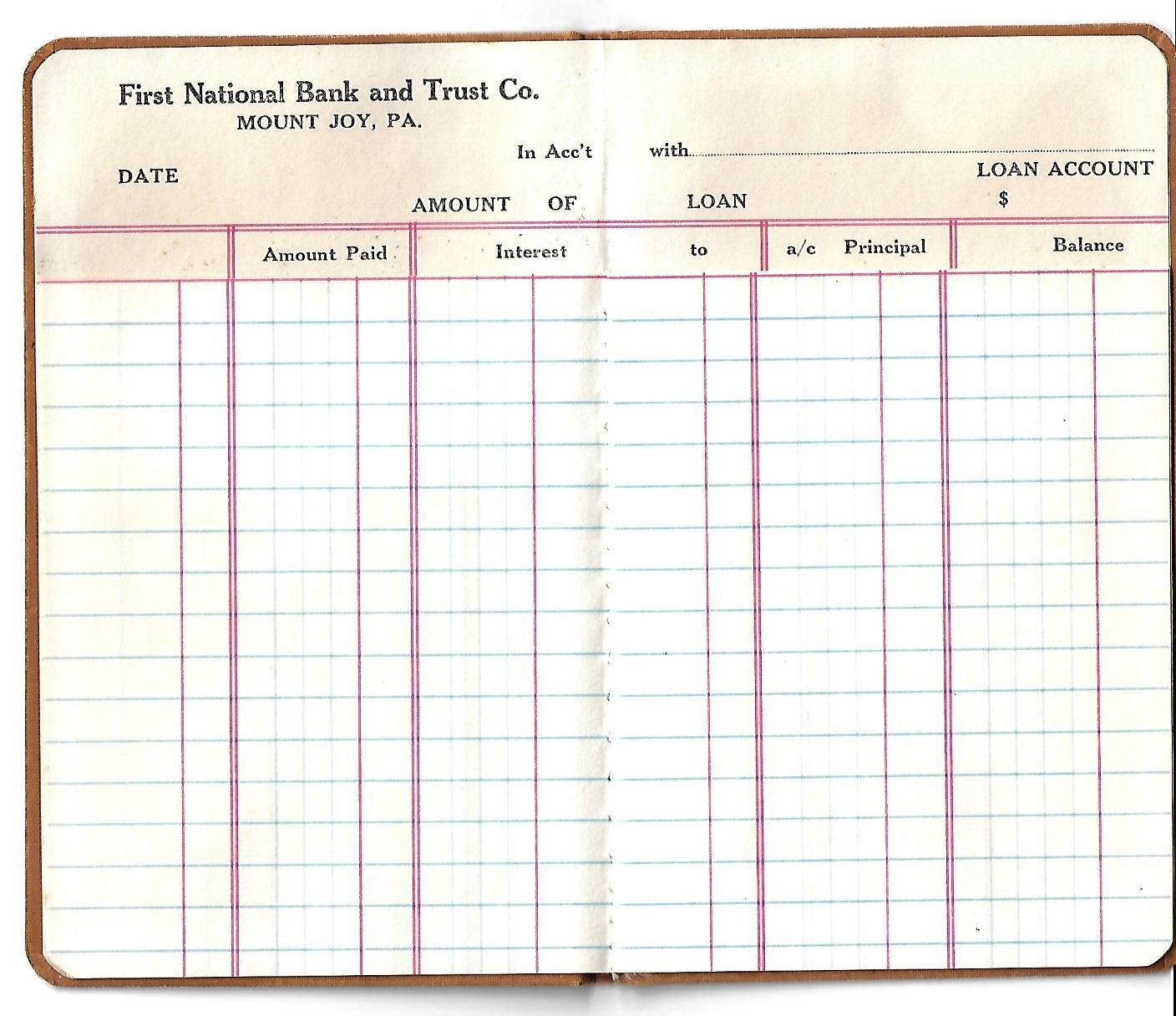 “First National Bank and Trust Co. Loan Account Book,” MJAHS Online Inventory, accessed December 19, 2025, https://mountjoyhistory.com/inventory/items/show/12824.