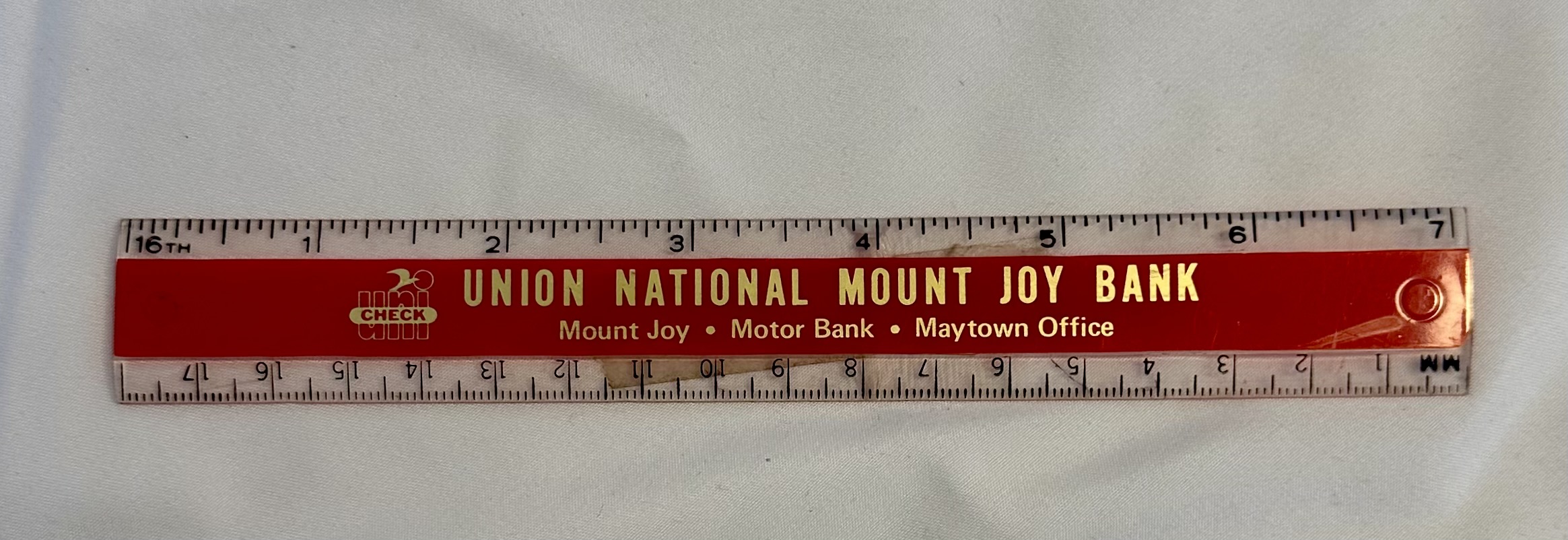 “Union National Mount Joy Bank 7" ruler,” MJAHS Online Inventory, accessed December 19, 2025, https://mountjoyhistory.com/inventory/items/show/12843.