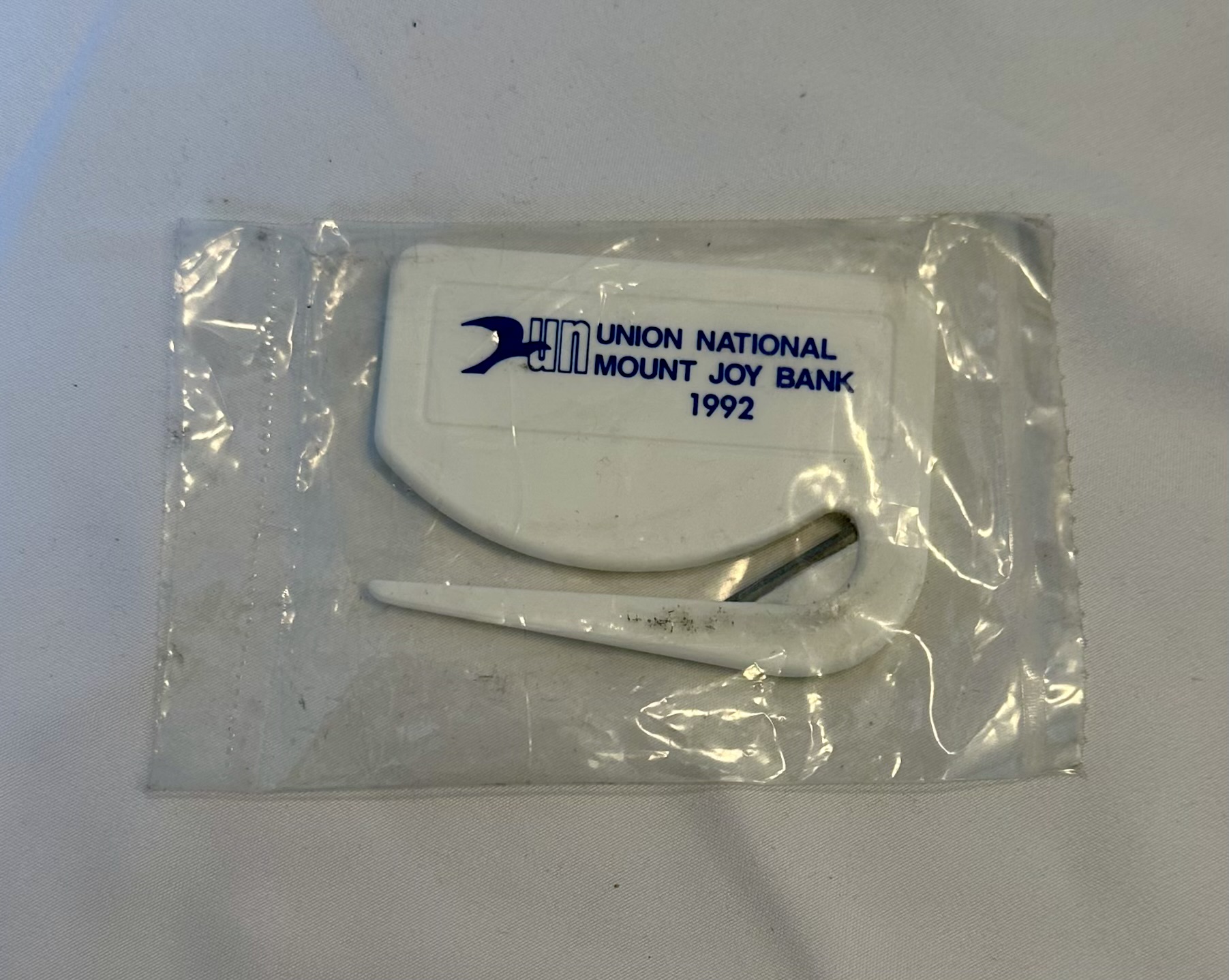 “Union National Mount Joy Bank 1992 letter opener (cutter), 1992,” MJAHS Online Inventory, accessed December 20, 2025, https://mountjoyhistory.com/inventory/items/show/12862.