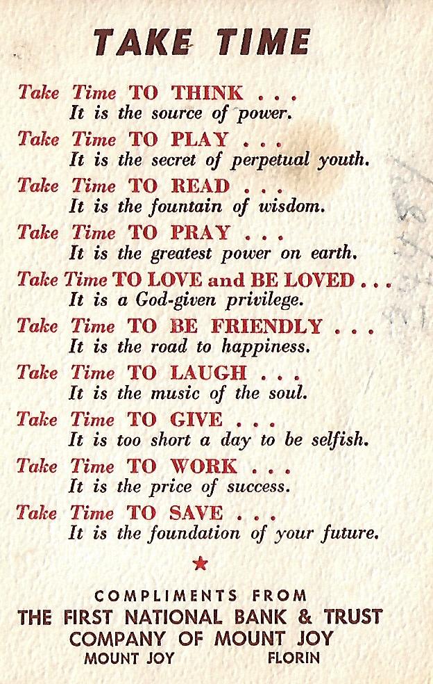 “The First National Bank & Trust Company of Mount Joy "Take Time" saying card,” MJAHS Online Inventory, accessed December 20, 2025, https://mountjoyhistory.com/inventory/items/show/12863.