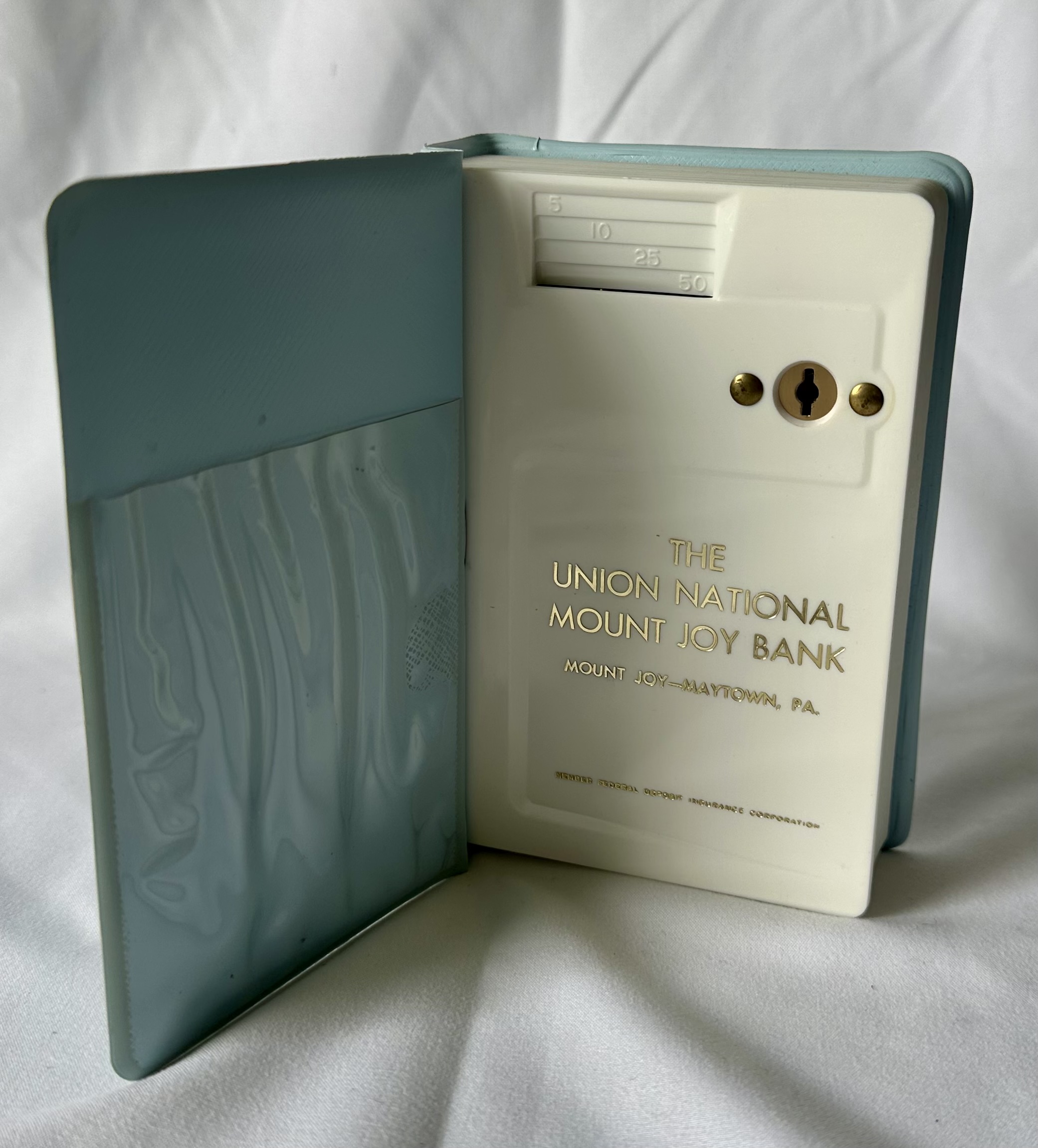 Union National Bank Baby's bank, Mount Joy, Maytown, book coin bank, FDIC
