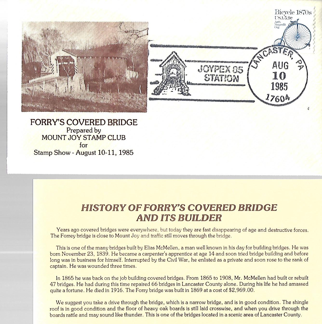 Forry's Covered Bridge First Day Cover Stamp Club, August 10, 1985, Mount Joy Stamp Club, Stamp Show, Elias McMellen, Civil War, November 23, 1839, 1865, 1916, 1869
