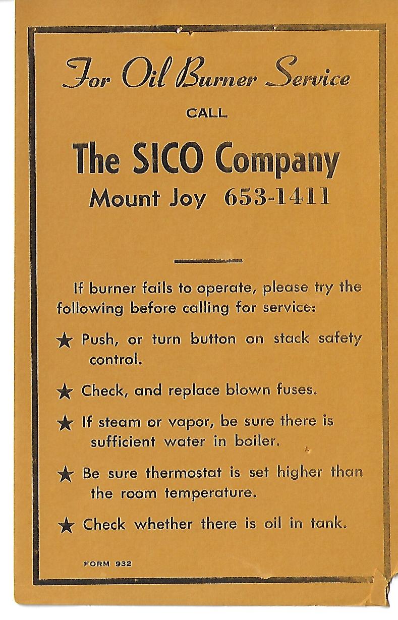 “Sico Company Oil Burner Service operating card,” MJAHS Online Inventory, accessed December 20, 2025, https://mountjoyhistory.com/inventory/items/show/12954.