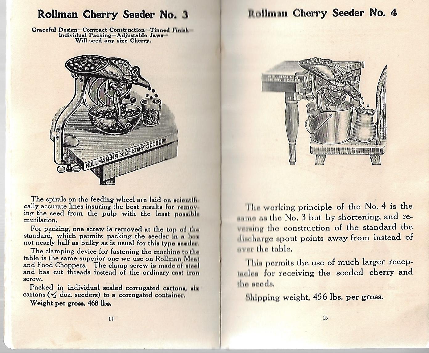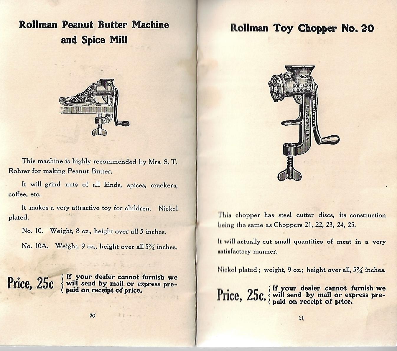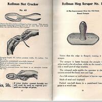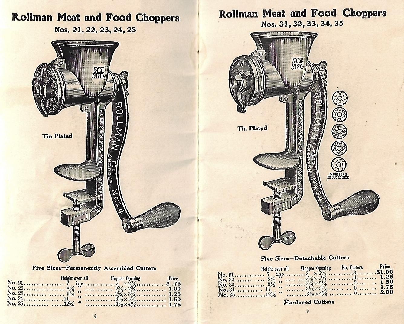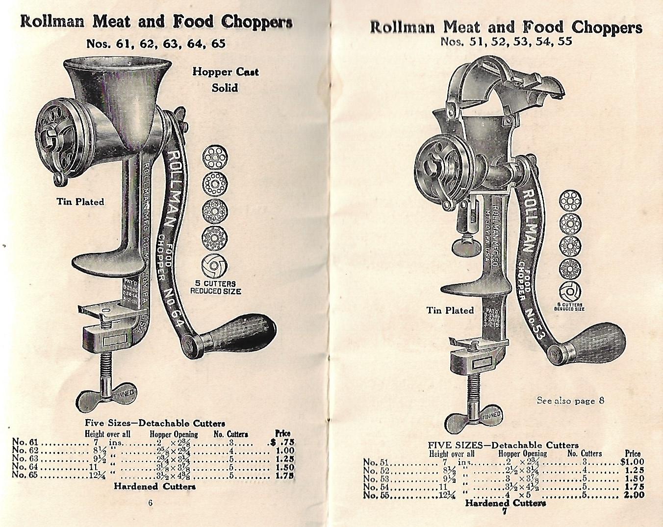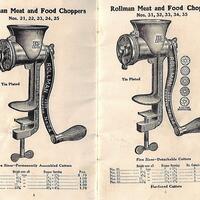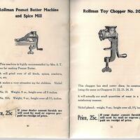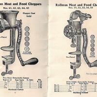 Rollman Household Specialties Catalog No. 1485, meat and food choppers, cherry seeder, apple cutter, peach stoner, nut cracker, hog scraper, peanut butter machine, spice mill, toy chopper