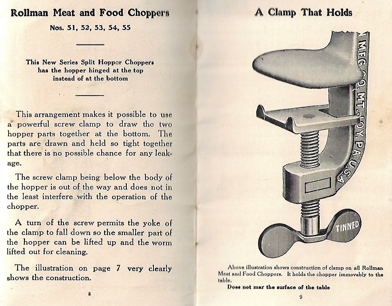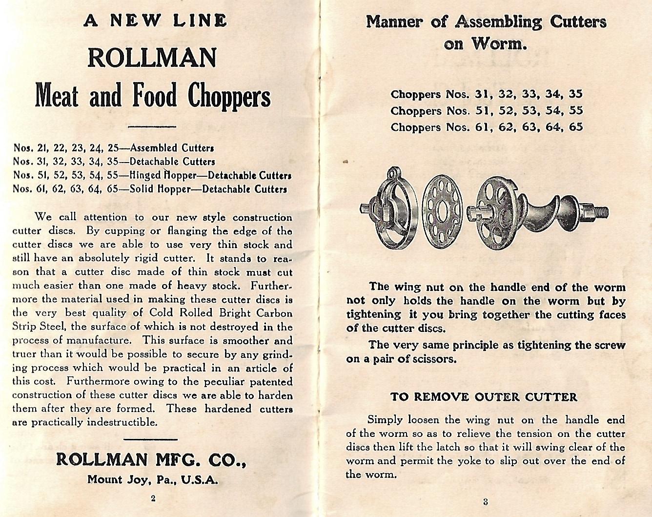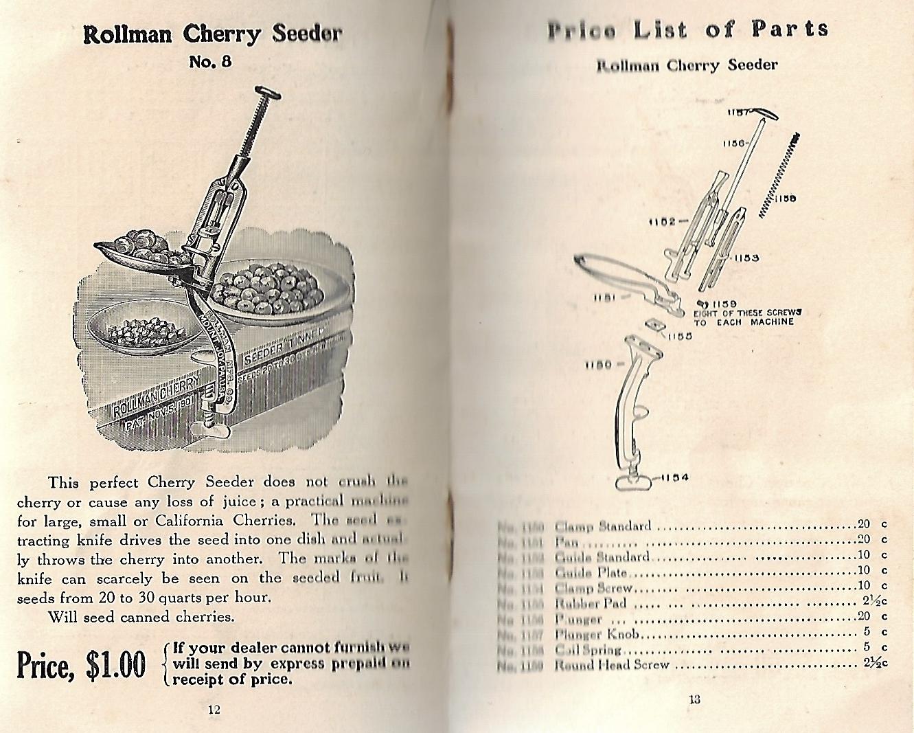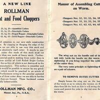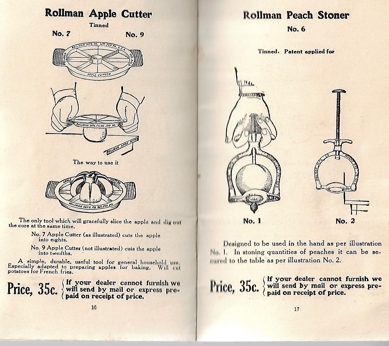 Rollman Household Specialties Catalog No. 1485, meat and food choppers, cherry seeder, apple cutter, peach stoner, nut cracker, hog scraper, peanut butter machine, spice mill, toy chopper