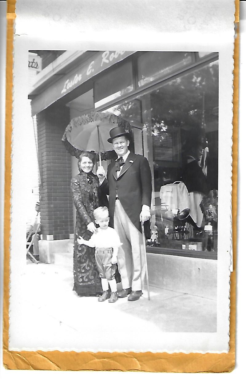 Photograph of Bill Roberts (grandson) in front of Lester E Roberts Appliance Store. He grew up to become a local policeman.