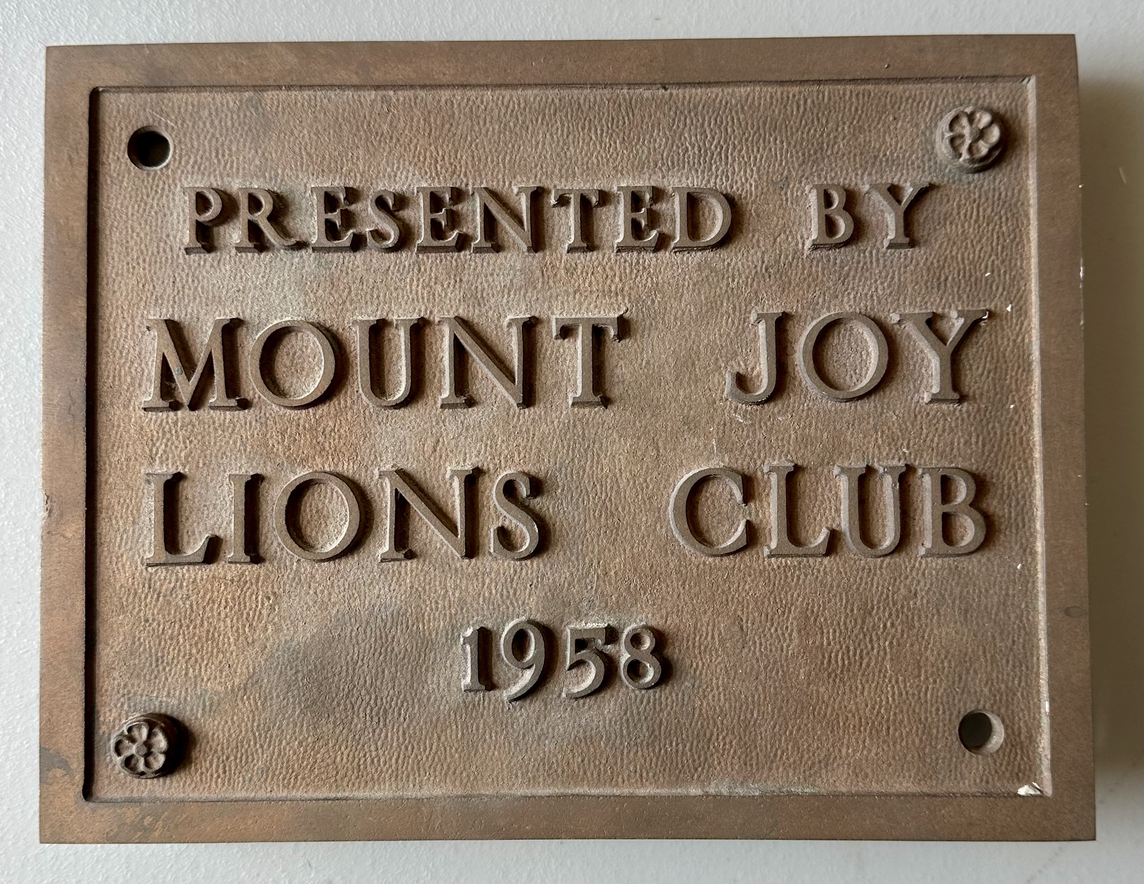 Plaque from brick building at Joyland, presented by Mount Joy Lions Club, 1958