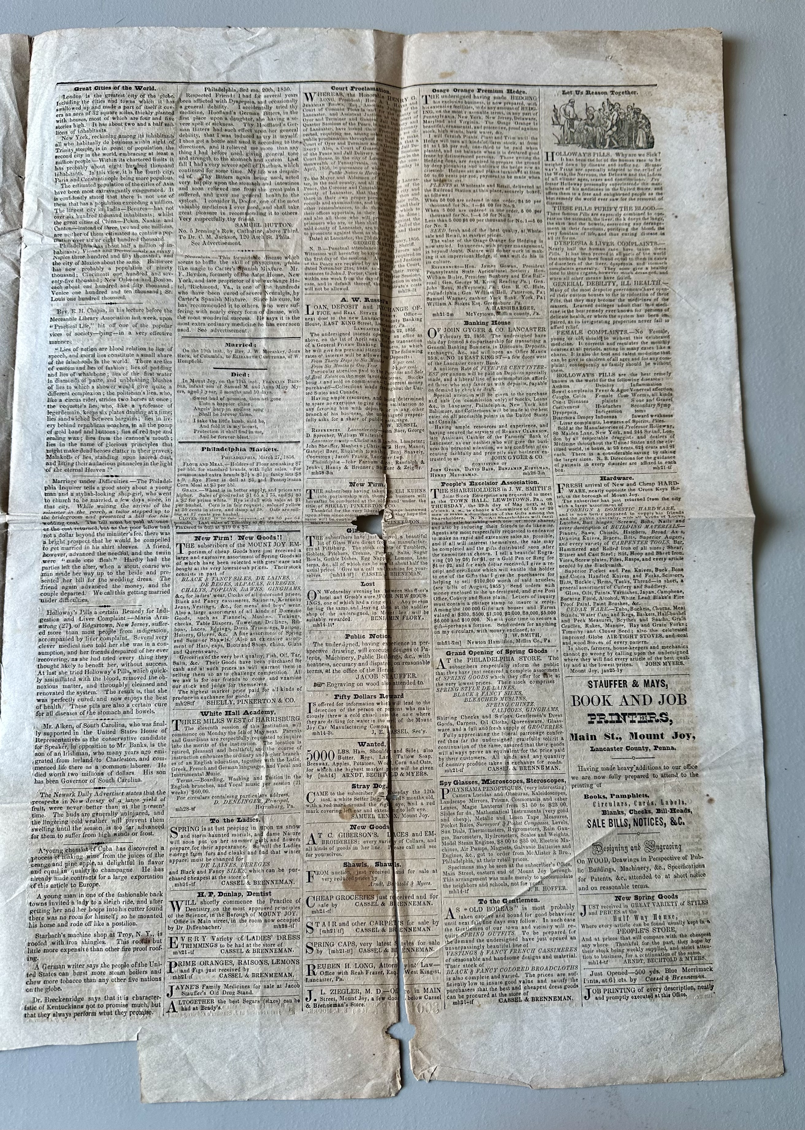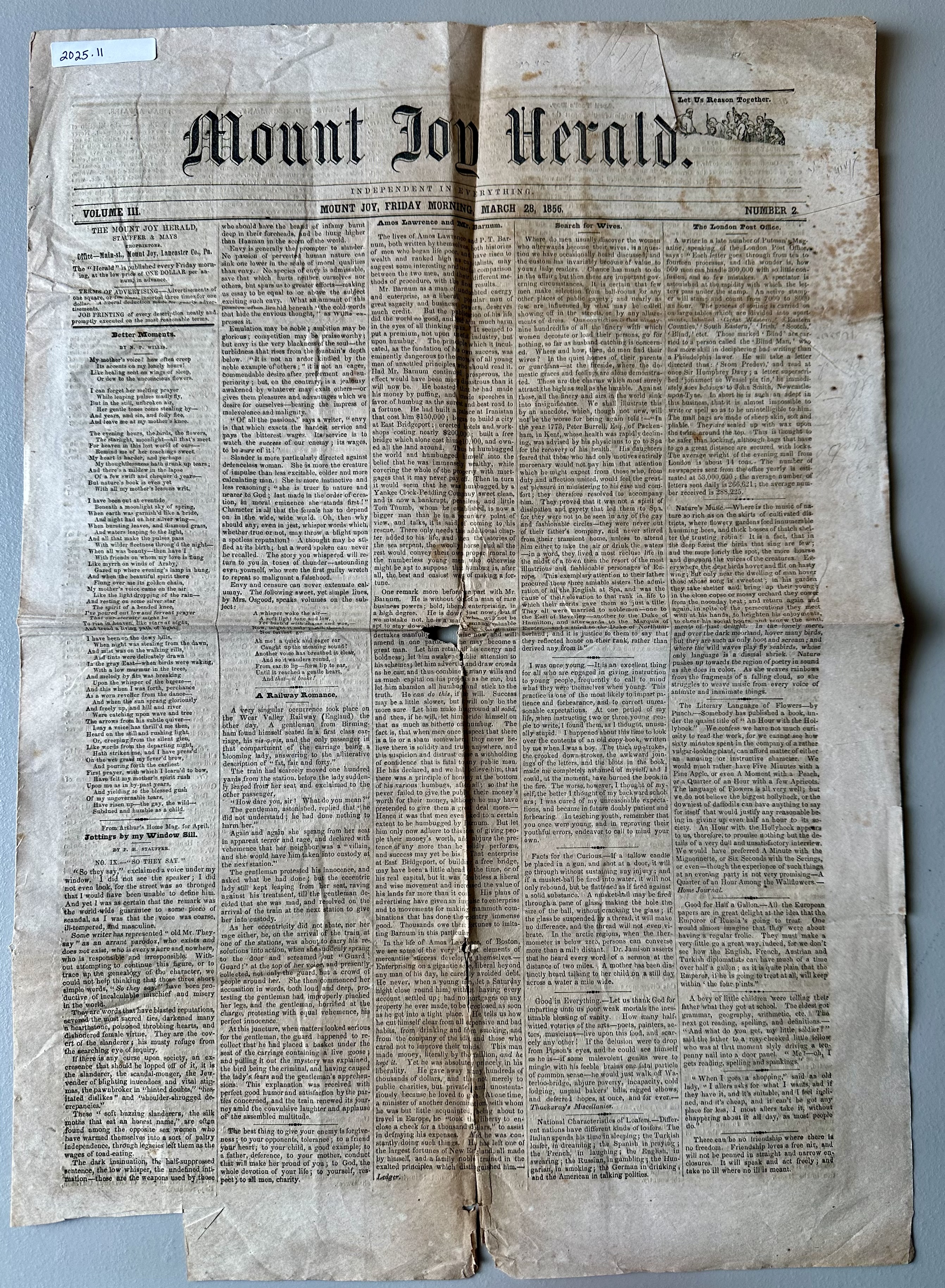 “Mount Joy Herald Newspaper, Friday morning, March 28, 1856, Number 2, Volume III,” MJAHS Online Inventory, accessed December 19, 2025, https://mountjoyhistory.com/inventory/items/show/13029.