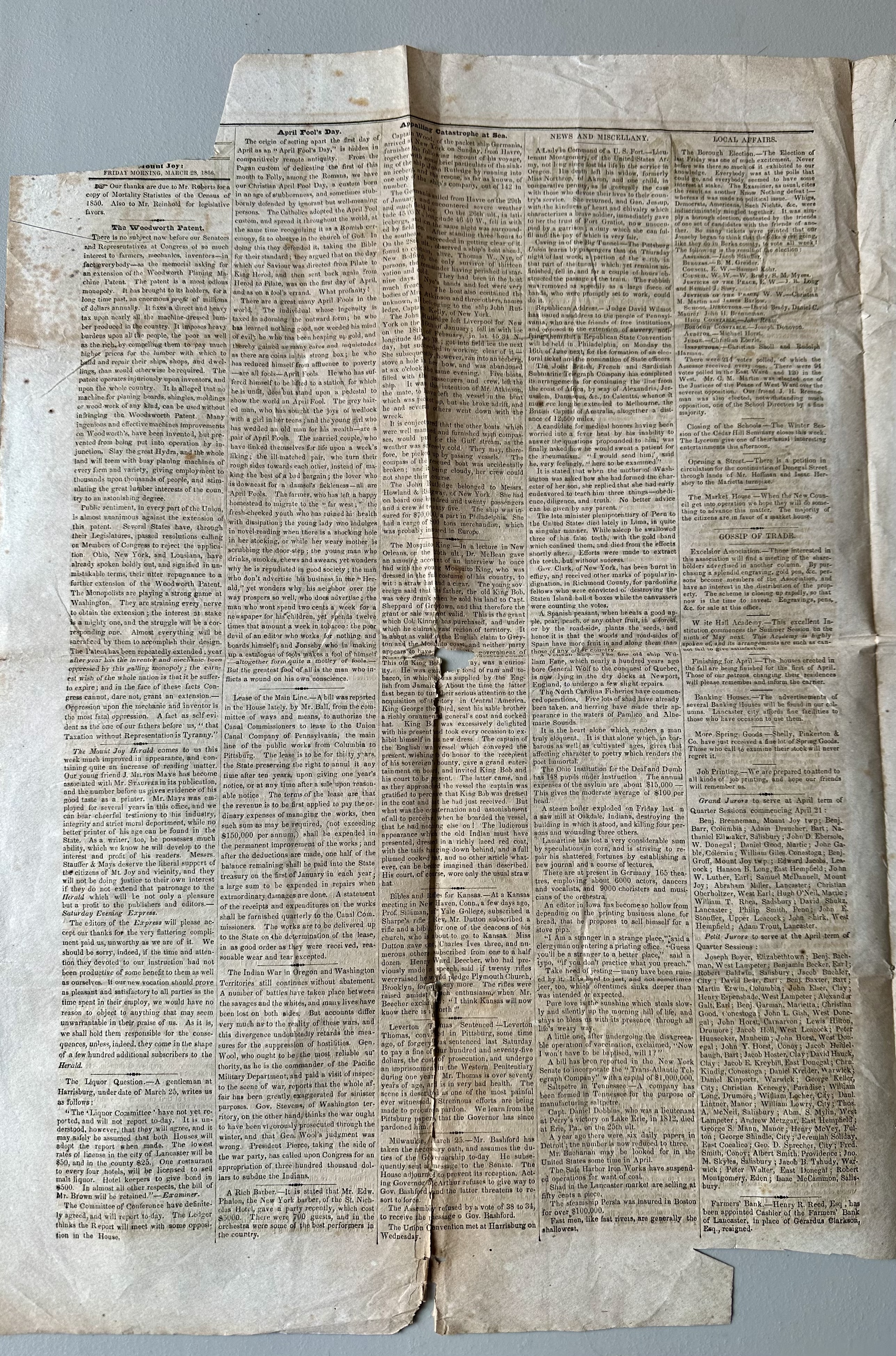 Mount Joy Herald Newspaper, March 28, 1856, $1, Amos Lawrence, Mr. Barnum, London Post Office, Europe, April Fool's Day, Sinking Ship, Liquor, Woodworth Patent, Indian War, Maine Line, Kansas, David Wilmot, White Hall Academy