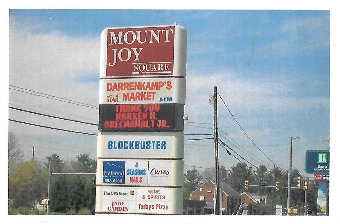Mount Joy Square, Darrenkamp's Market, Warren H. Greenawalt Jr., Blockbuster, Preferred Realty Group, 4 Seasons Nails, Curves, The UPS Store, Wine & Spirits, Jade Garden, Today's Pizza
