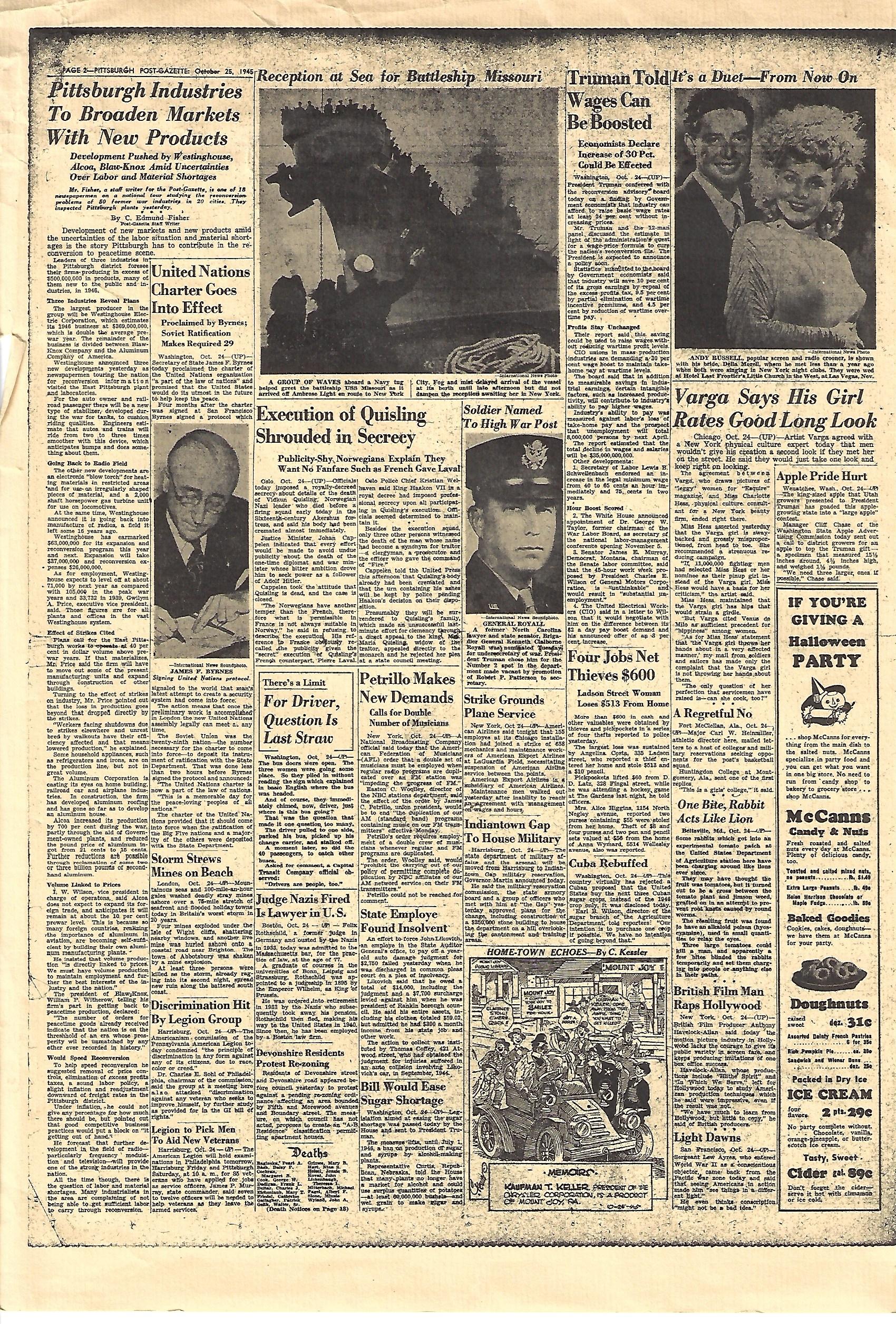 C. Kessler, cartoon, Kaufman T. Keller, news article, October 2, 1945, Clarence, Stoll, Mount Joy Public Library, Chrysler Corporation