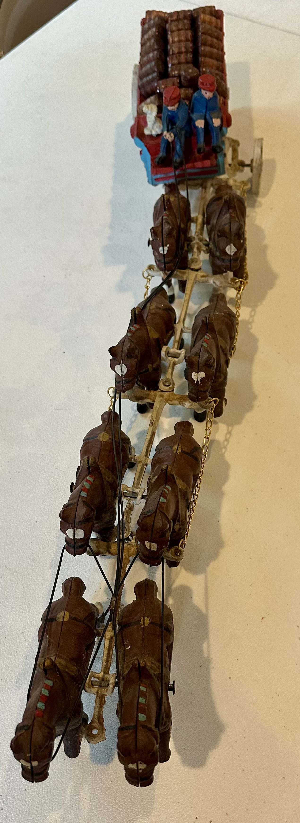Grey Iron, Clydesdale horses with wagon carrying beer kegs, toy