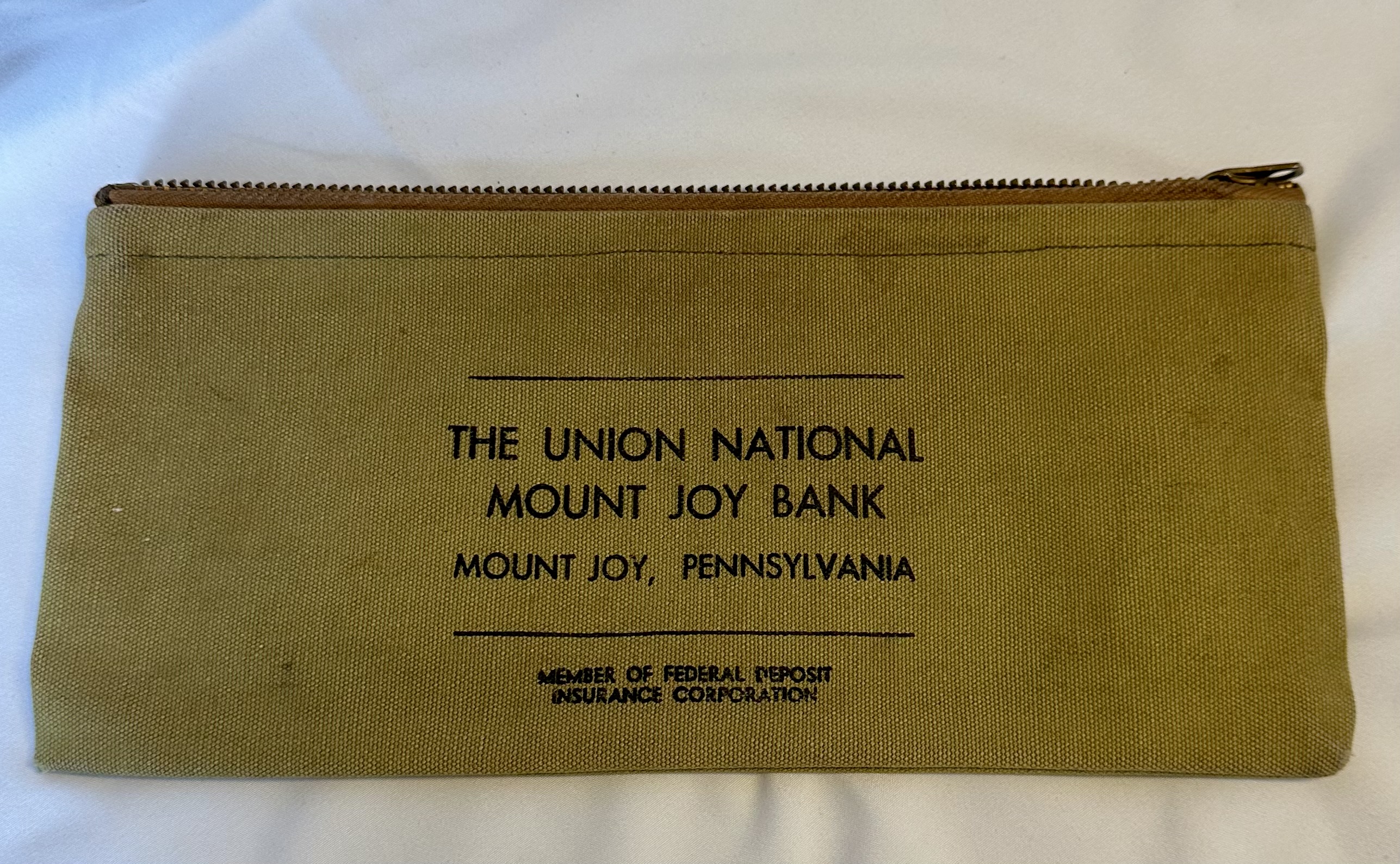 “The Union National Mount Joy Bank Green Canvas Zippered Money Bag,” MJAHS Online Inventory, accessed December 19, 2025, https://mountjoyhistory.com/inventory/items/show/13058.
