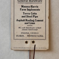 L. W. Mumma, General Hardware, Billhook, Advertisement, Massey Harris, farm implements, terra cotta, steel pipe, asphalt roofing, cement, lime, Florin