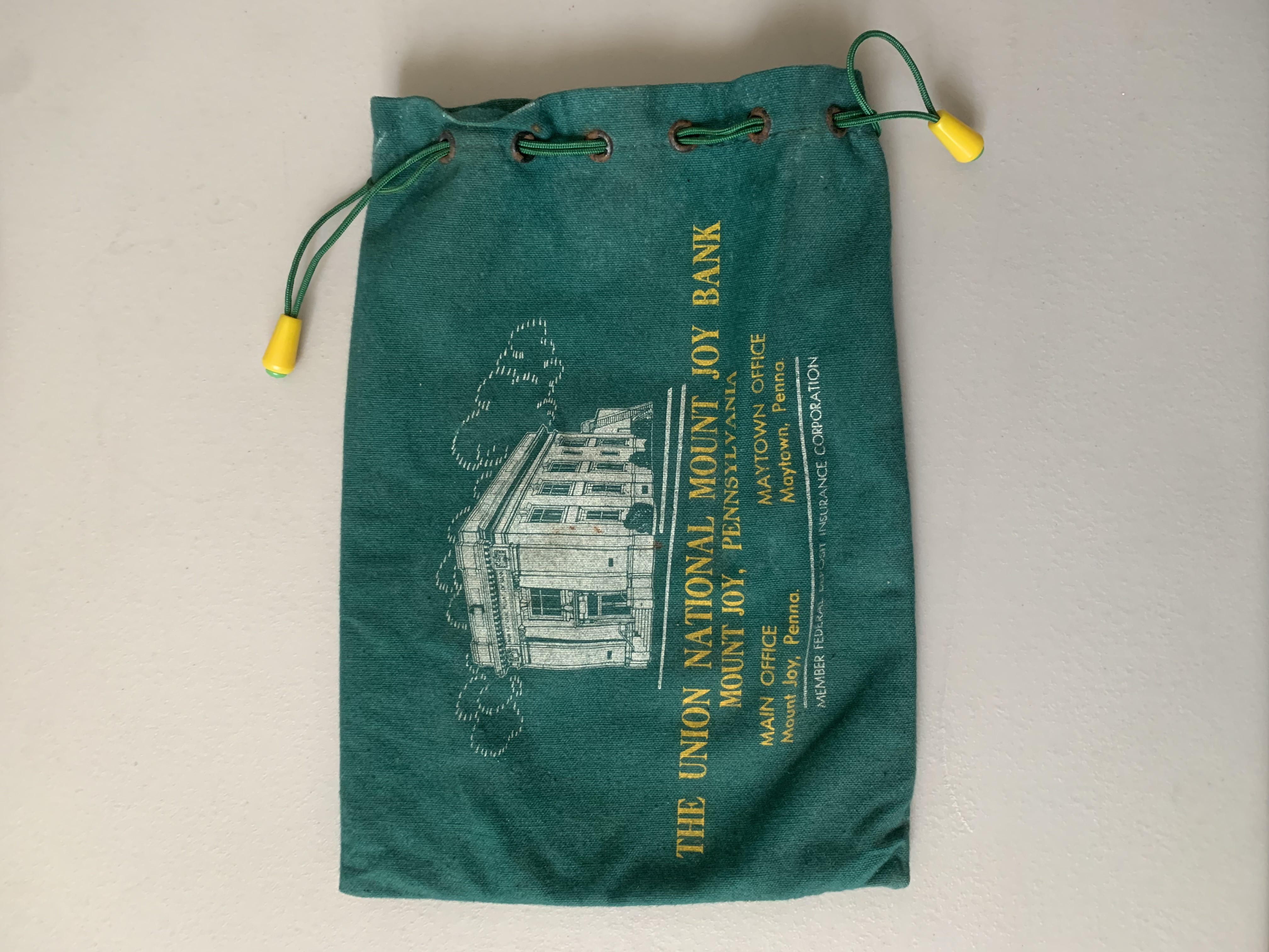 “The Union National Mount Joy Bank Bag,” MJAHS Online Inventory, accessed October 15, 2025, https://www.mountjoyhistory.com/inventory/items/show/11693.