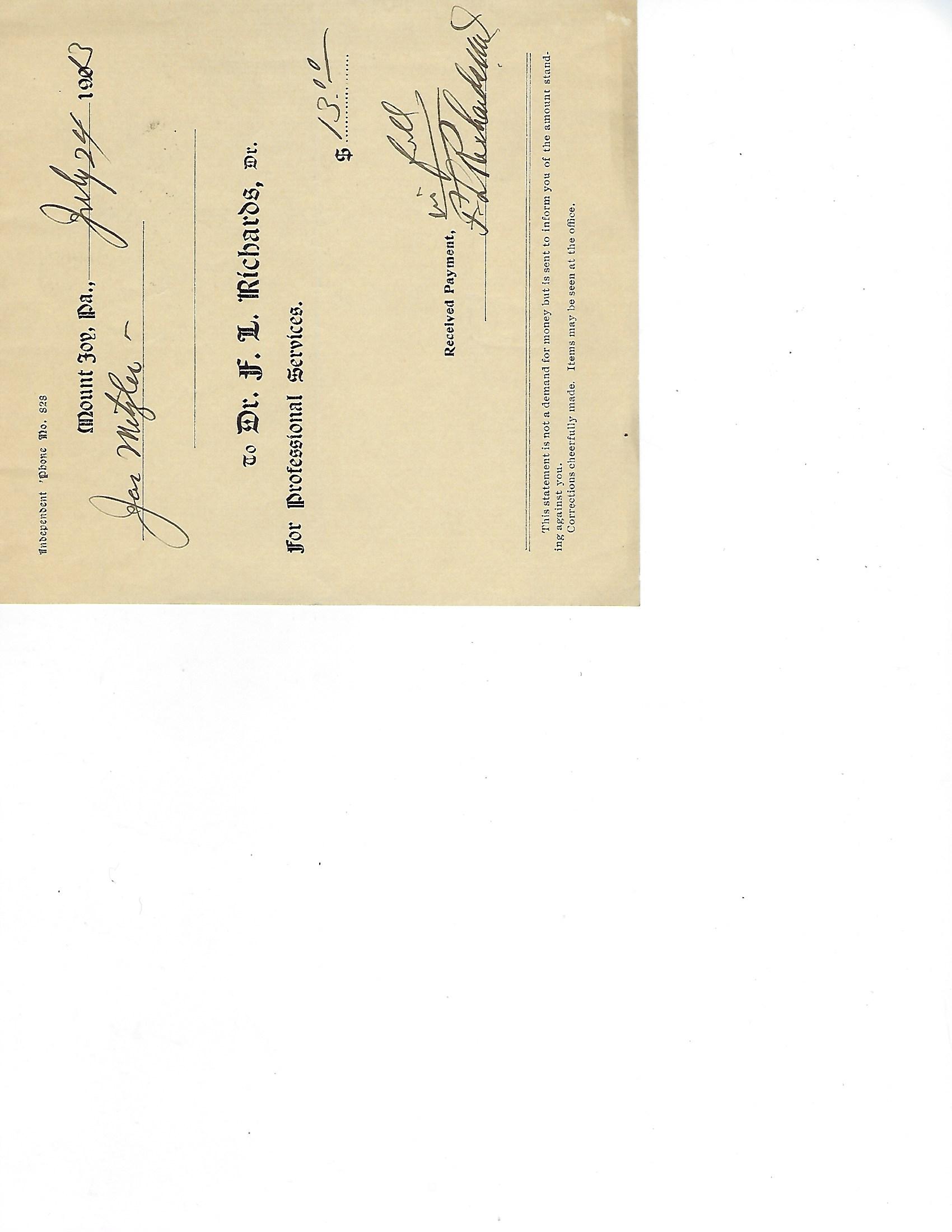 “Receipt - Dr. F.L. Richards,” MJAHS Online Inventory, accessed October 15, 2025, https://www.mountjoyhistory.com/inventory/items/show/11704.