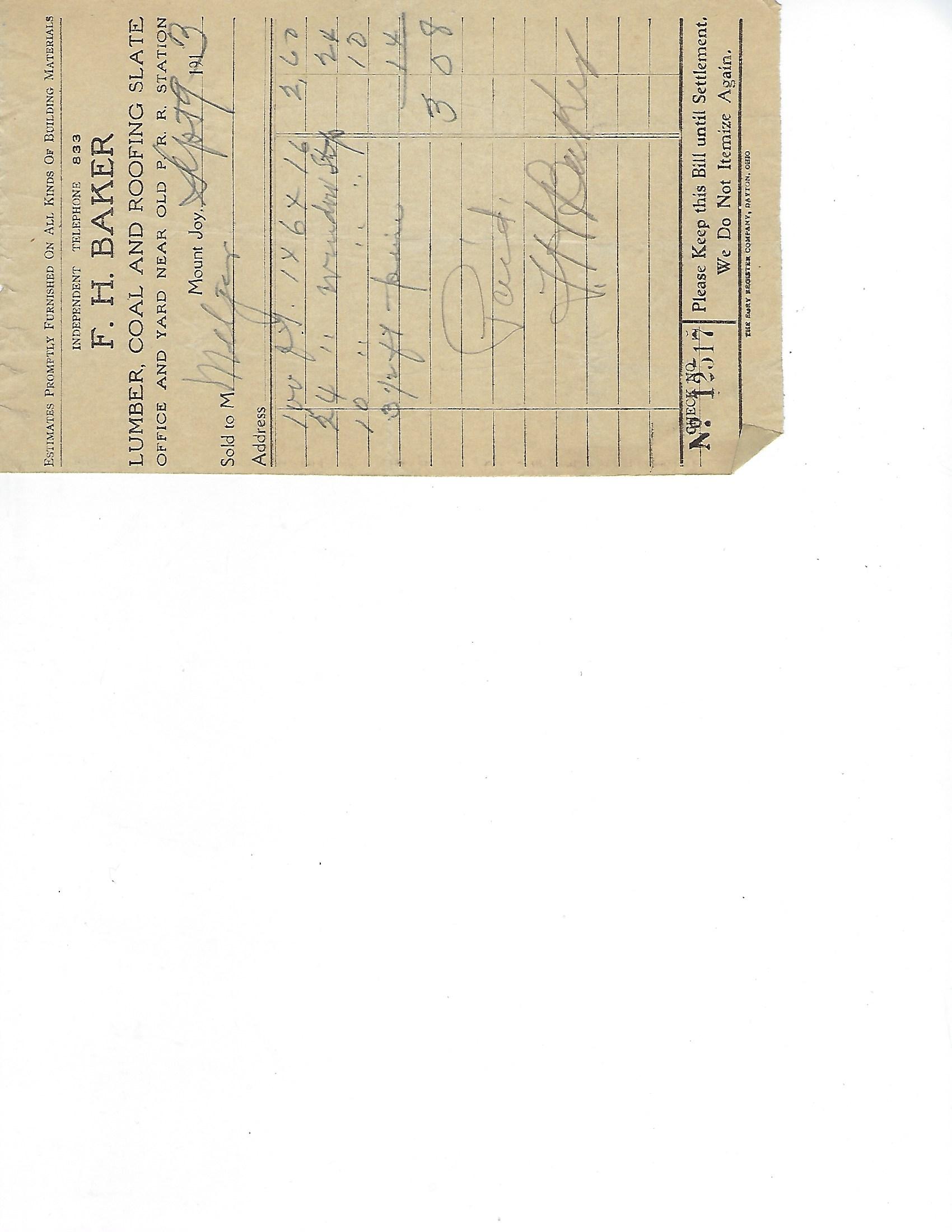 “Receipt - F.H. Baker Lumber, Coal, and Roofing Slate,” MJAHS Online Inventory, accessed October 15, 2025, https://www.mountjoyhistory.com/inventory/items/show/11705.