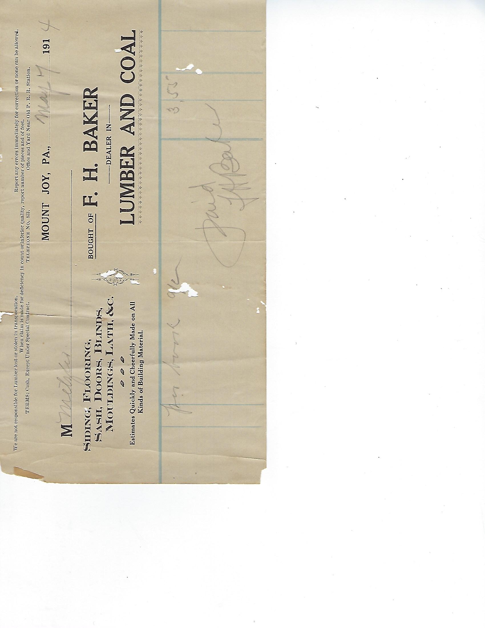 “Receipt - F.H. Baker Lumber, Coal, and Roofing Slate,” MJAHS Online Inventory, accessed October 16, 2025, https://www.mountjoyhistory.com/inventory/items/show/11706.
