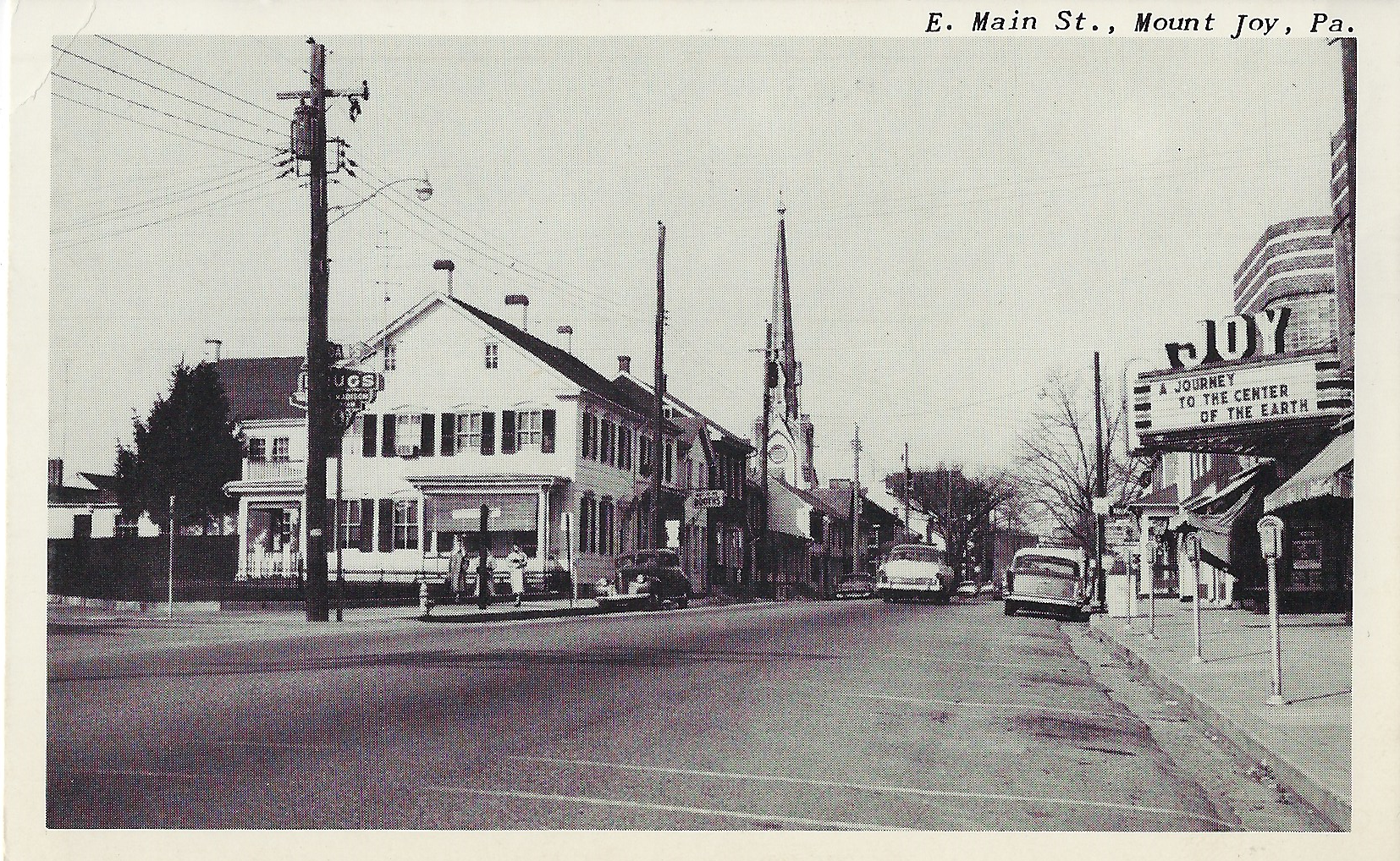 "E. Main St., Mount Joy, Pa." Postcard, location at the Joy Theatre, Sloans and Booth's. "Journey to the Center of the Earth", which was released in 1959, on the theater marquee.