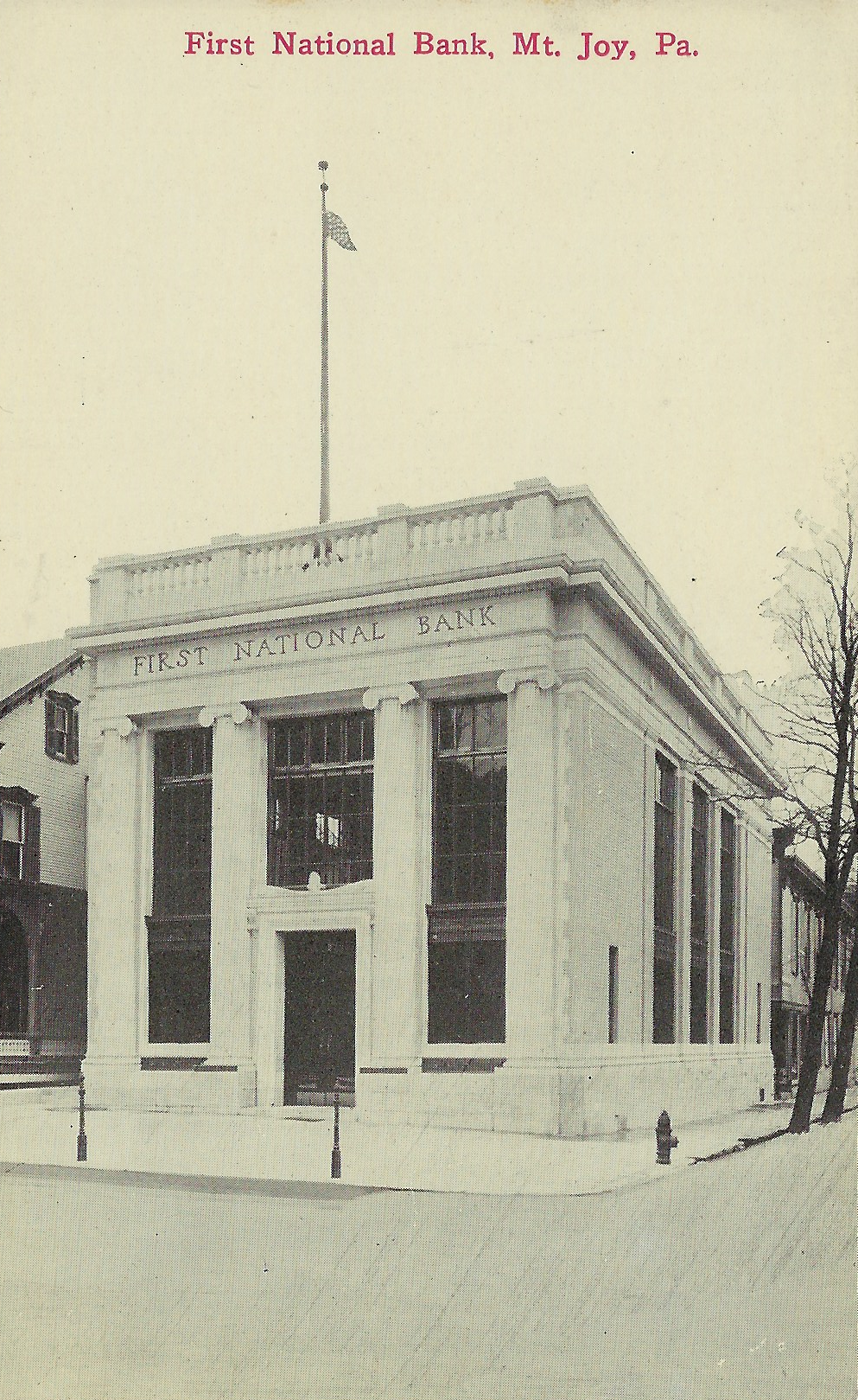 Post Card Distributing Co., Philadelphia, PA, “1st National Bank at the corner of Market Street and Main Street postcard,” MJAHS Online Inventory, accessed October 16, 2025, https://www.mountjoyhistory.com/inventory/items/show/11839.