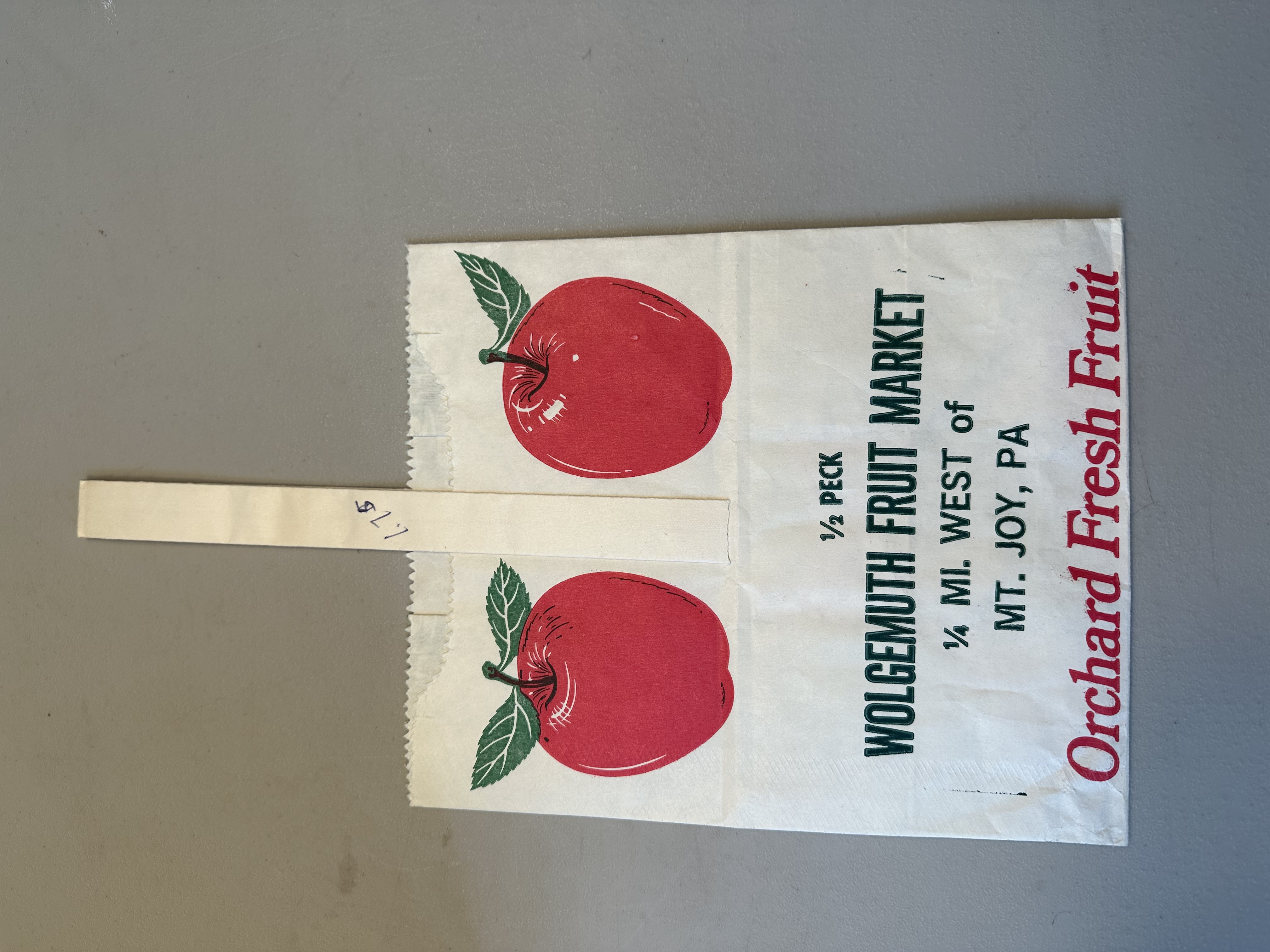 “Wolgemuth Fruit Market handled paper bag, 1/2 mile west of Mount Joy,” MJAHS Online Inventory, accessed October 16, 2025, https://www.mountjoyhistory.com/inventory/items/show/11905.