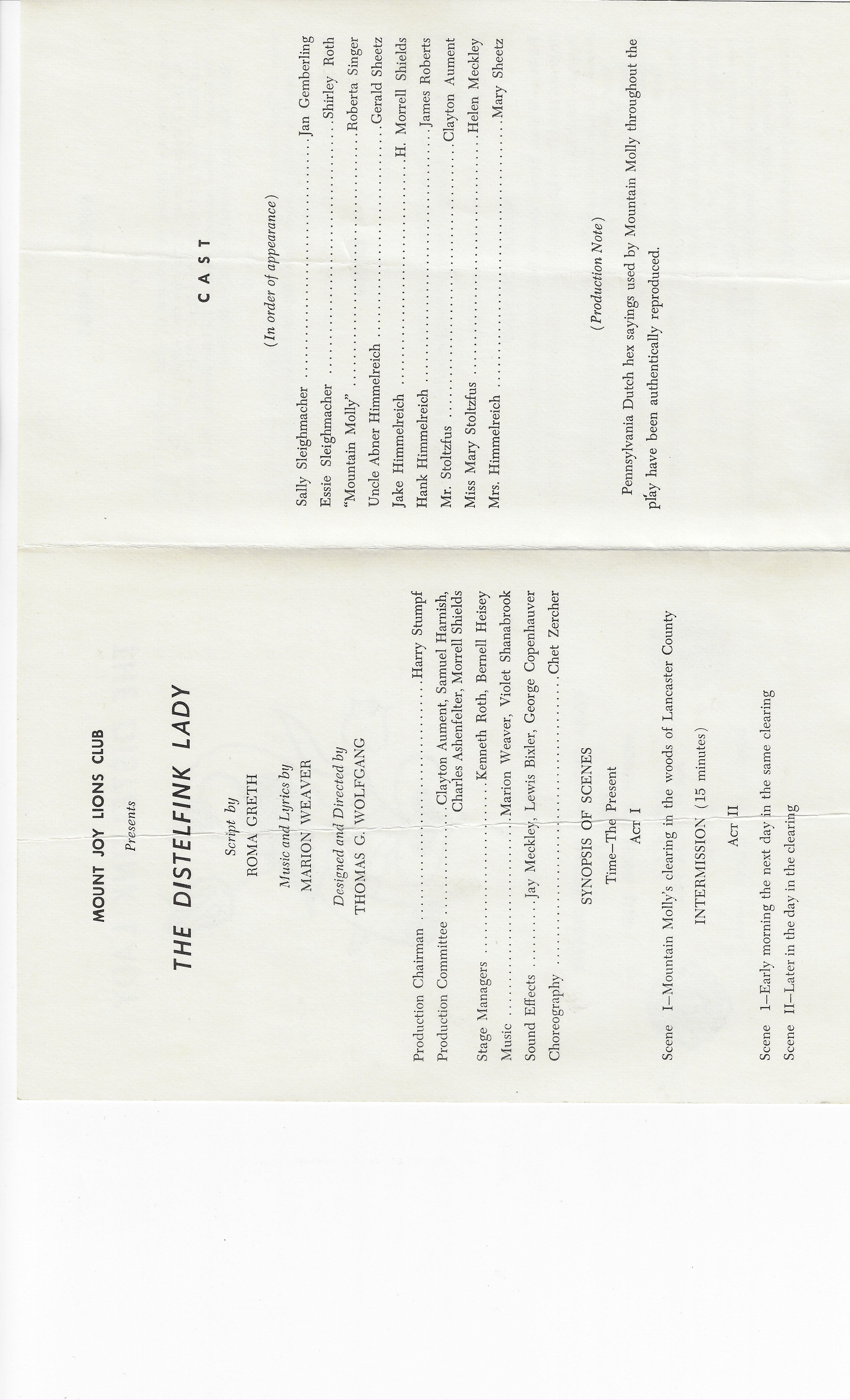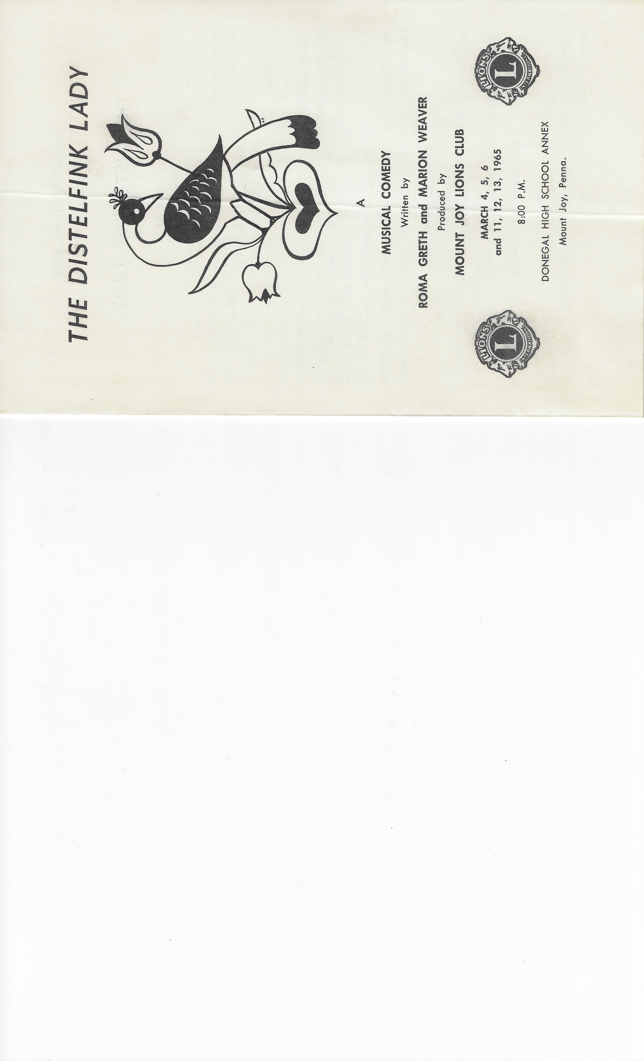 Mount Joy Lions Club, “Lions Club play bill, The Distlefink Lady, 1965,” MJAHS Online Inventory, accessed October 14, 2025, https://www.mountjoyhistory.com/inventory/items/show/11926.